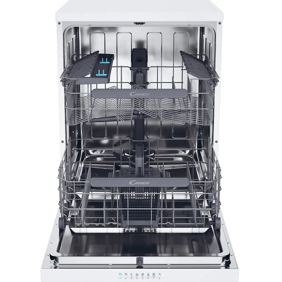 Lave-vaisselle pose libre Candy 14 couverts avec 8 programmes, dont Wash&Dry 35 min, connectivité Wi-Fi + Bluetooth, porte à ouverture automatique, moteur Speed-Drive Inverter, niveau sonore 44 dB, départ différé 1-23h.