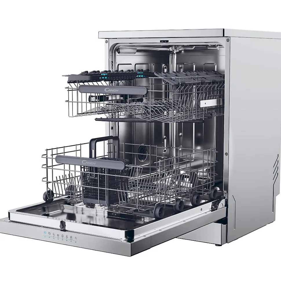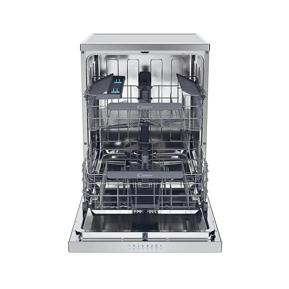 Lave-vaisselle pose libre Candy CF4E4F0X avec 14 couverts, 8 programmes, dont le rapide Wash&Dry 35 min, faible niveau sonore de 44 dB et connectivité WiFi/Bluetooth. Moteur éco et ouverture automatique de porte pour un séchage efficace.