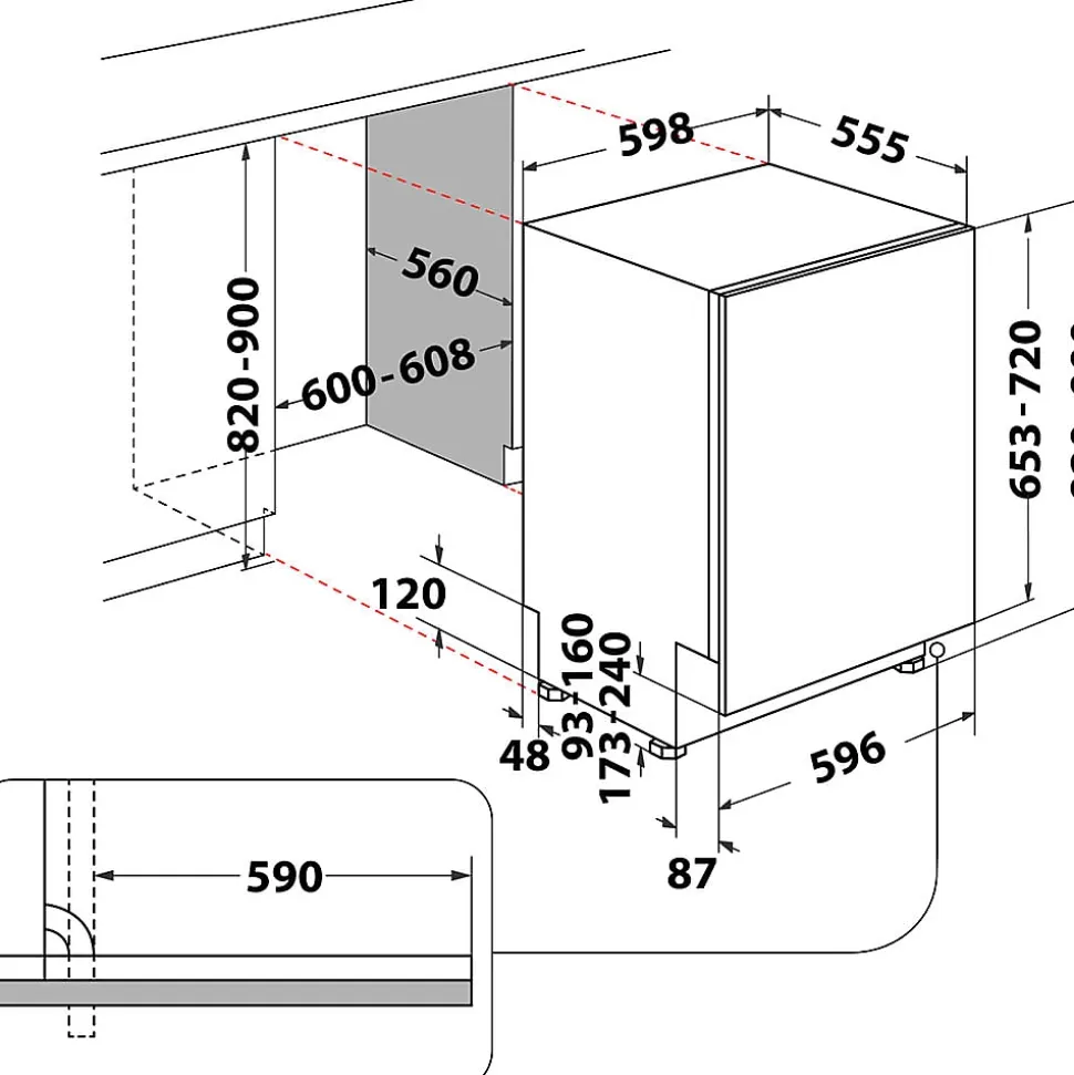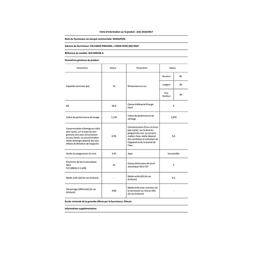 Lave-vaisselle 60cm 14 couverts 46db tout intégrable Whirlpool – Ce lave-vaisselle W2IHKD526A de Whirlpool a une capacité de 14 couverts. Un programme spécifique qui réduit le niveau sonore d’un décibel tout en atteignant des performances de lavage et de séchage parfaites. Le programme Demi- charge est idéal lorsque vous avez une petite quantité de vaisselle peu sale à laver. – Type de produit : Lave-vaisselle.Type de construction : Tout intégrable.Nombre de couverts standard : 14.IEE : 55.9.Classe d’efficacité énergétique : E.Classe d’efficacité de lavage : A.Classe d’efficacité de séchage : A.Indice de performance de lavage : 1.13.Indice de performance de séchage : 1.07.Conso. d’énergie par cycle en programme éco (kWh) : 0.95.Conso. d’eau par cycle en programme éco (L) : 9.5.Conso. d’eau annuelle (L/an) : 2660.Conso. d’énergie pour 100 cycles (kWh) : 95.Durée du programme éco (h:min) : 3:35.Emissions acoustiques dans l’air dB(A) re 1 pW : 46.Classe d’émission de bruit acoustique dans l’air : C.Indice de réparabilité (Note /10) : 7.8.Mode veille (W) : 0.5.Démarrage différé (W) : 4.Lave-vaisselle connecté : Non.Nbre de programmes : 9.Prélavage : Oui.Intensif : Oui.Rapide : Oui.Eco : Oui.Silence : Oui.Programmes spéciaux : Lavage et séchage rapides 50°C, 6ème sens, Antibactérien 65°C, Auto-nettoyage 65°C.Départ différé : Oui.Type de départ différé : 1-12 h.Demi-charge : Oui.Tablettes tout en un : Oui.Ecran : Oui.Voyant niveau liquide de rinçage : Oui.Top amovible : Sans top.Porte à habiller : Oui.Porte d’habillage fournie : Non (nécessite la pose d’une porte assortie à la cuisine).Poids de porte supporté (kg) : 10.Type de moteur : Inverter.Matériau de la cuve : Acier inoxydable.Raccordement eau chaude : Oui.Eclairage intérieur : Non.Hauteur de panier
