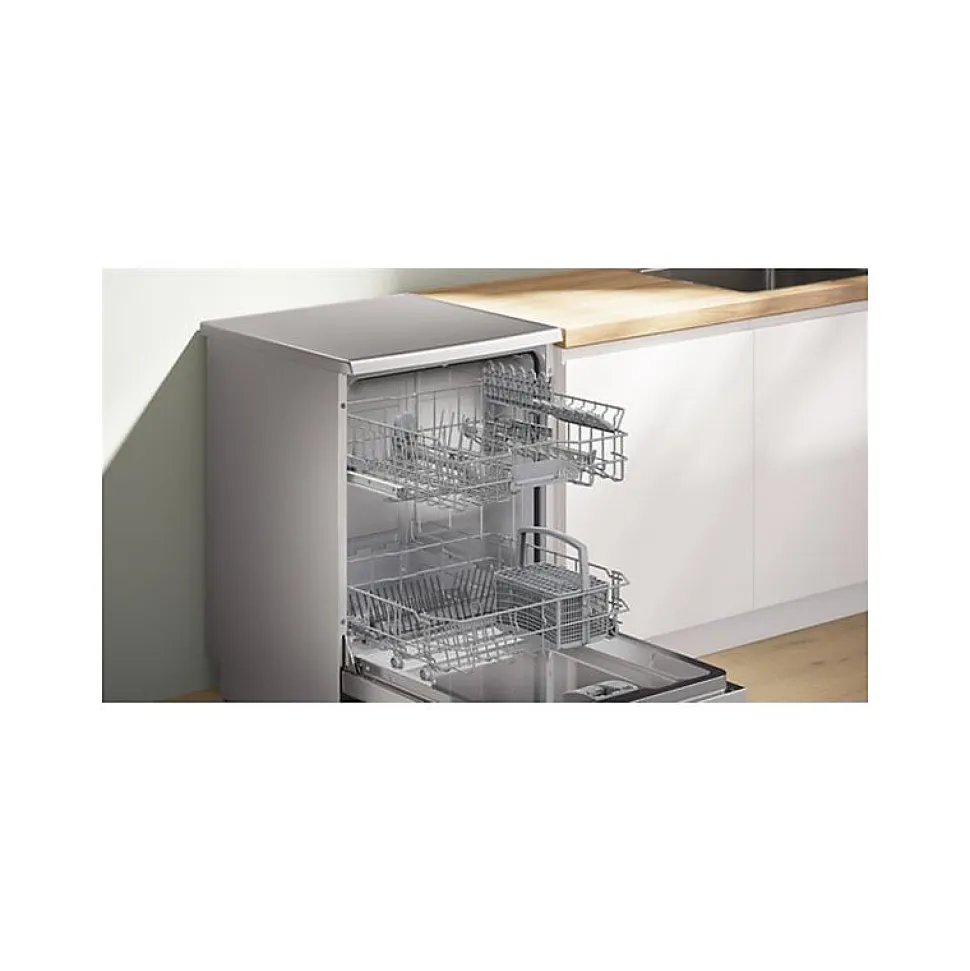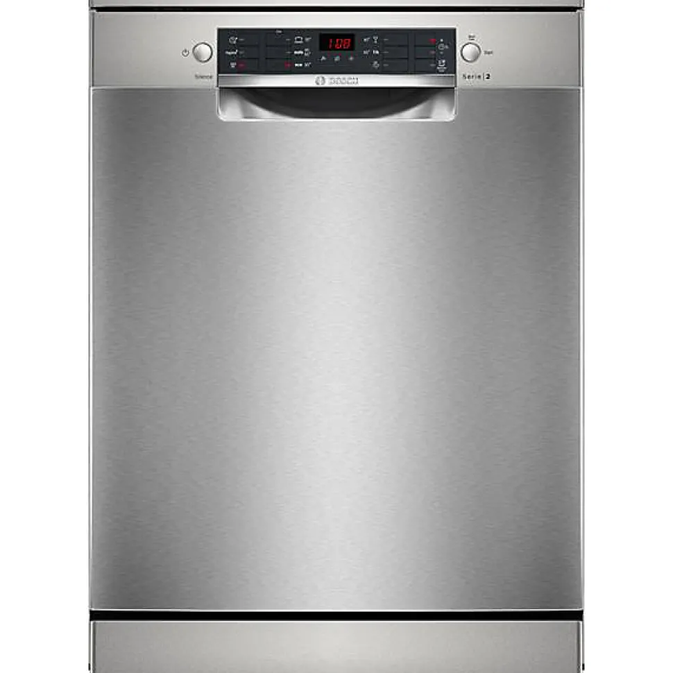 Lave‑vaisselle Bosch 60 cm SMS26AI01F, 12 couverts, moteur EcoSilence Drive, 6 programmes (Intensif, Auto, Eco, Verre, 1h, Prélavage), options VarioSpeed Plus, Hygiène Plus et Séchage Extra. AquaStop, échangeur thermique, panier supérieur RackMatic réglable 3 positions, triple filtre autonettoyant. Consommation : 9,5 L/cycle, 0,92 kWh/cycle (92 kWh/100 cycles). Niveau sonore 48 dB(A). Finition inox anti-traces. Garantie 2 ans.