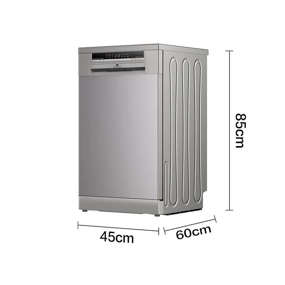 Lave-vaisselle pose libre compact 45 cm Continental Edison CELV1145S, 11 couverts, design silver, fonctionnement discret (45 dB), consommation d’eau 10 L/cycle et économie énergétique (classe D). Équipé de 6 programmes, tiroir à couverts, départ différé, adoucisseur intégré, affichage digital et sécurités anti-fuite et enfant.