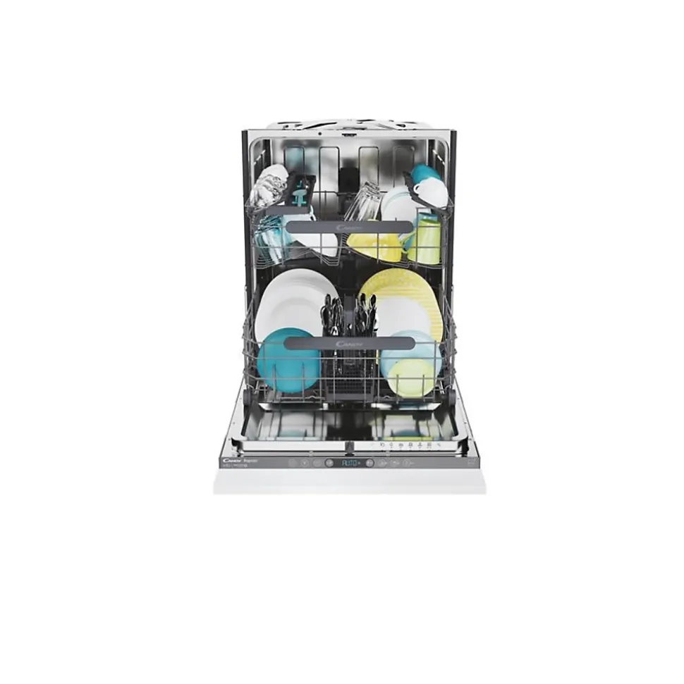 Lave-vaisselle tout intégrable 15 couverts 44 db tout intégrable Candy – Lave-vaisselle Tout intégrable Candy CS5C4F0A1 avec Maxi-cuve. Les lave-vaisselle Candy Rapidò sont dotés de la cuve la plus spacieuse du marché. Grâce à cela, vous pourrez même laver les articles les plus volumineux tels que les lèchefrites, les planches à découper ou encore les louches. Grâce au système de glissières, notre lave-vaisselle est conçu pour une adaptation parfaite à tout meuble de cuisine. La porte d’habillage peut atteindre 80 cm de hauteur et la plinthe peut être réduite jusqu’à 2 cm. Le témoin lumineux du FloorLight est projeté sur le sol, en dessous de la porte, pour vous indiquer qu’un cycle est en cours. Une fois ce dernier terminé, le témoin disparaît pour vous prévenir que la vaisselle peut être retirée sans danger. Grâce à l’application hOn, accédez à des conseils personnalisés, des programmes spéciaux et contrôlez à distance votre lave-vaisselle pour gagner du temps et rendre votre expérience simple et facile. De plus, grâce aux fonctions Snap&Wash & Dishplacer, l’application détermine le cycle de lavage le plus adapté à votre vaisselle en prenant simplement une photo de votre panier chargé ou encore vous pouvez obtenir des conseils pour optimiser les chargements. – Type de produit : Lave-vaisselle Tout intégrable.Nombre de couverts : 15.Niveau sonore : 44 dB.Conso élec. : 75 kWh/100 cycles.Conso eau : 10,9 L/cycle de référence.Tiroir à couverts : Non.Matériau de la cuve : Inox.Voyant de rinçage : Oui.Voyant de sel : Oui.Durée Prog. ECO : 237 min.Départ différé : Jusqu’à 23 heures.Afficheur Temps Restant : Non.Connecté : Oui.Ouv. porte auto Fin de cycle : Oui.Label énergie : C.Catégorie sonore : B.Indice de réparabilité : 8,7/10.Le + produit : Porte à glissières.9 programmes dont Auto et Wash&Dry 35 min 60°.Options : Express et Tablettes.Panier supérieur réglable en