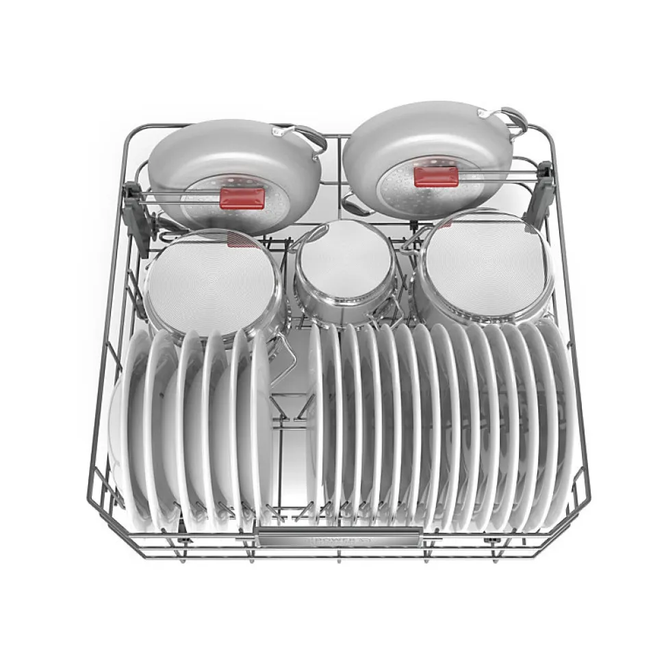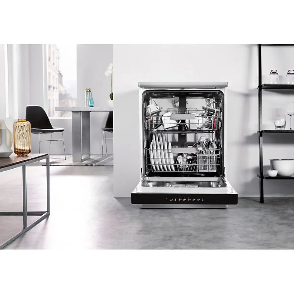 Lave-vaisselle Whirlpool WFC3C34PX, série Supreme Clean, 60 cm – Ce modèle affiche une capacité de 14 couverts, idéale pour les familles – Il propose 8 programmes dont Eco, Intensif et un mode Silence à 43 dB, parfait pour un lavage discret, même la nuit – Le programme intelligent 6ème Sens ajuste automatiquement température, durée et consommation d’eau selon le niveau de salissure – L’option PowerClean Pro libère de l’espace dans le panier inférieur grâce à 28 jets haute pression ciblés pour un lavage impeccable – La technologie Natural Dry permet une ouverture automatique de la porte en fin de cycle pour un séchage naturel, sans énergie superflue – Le départ différé 24 h et l’affichage digital apportent un vrai confort d’usage – Côté agencement, le panier supérieur est réglable en hauteur, amovible, avec 4 flaps escamotables – Le panier inférieur dispose d’un panier à couverts amovible et de 2 zones à picots rabattables – Le moteur à induction assure performance et silence, tandis que la cuve en inox garantit longévité – Une sécurité anti-débordement est également intégrée – Finition inox avec bandeau noir. Caractéristiques Nombre de couverts 14 Niveau sonore 44 dB Conso eau 9,5 L / cycle de référence Conso élec. 85 kWh / 100 cycles Durée Prog. ECO 190 min Labels et points clés Label énergie D Catégorie sonore B Indice de réparabilité 7,6 / 10 Le + produit Séchage Natural Dry Disponibilité des pièces détachées 10 ans (donnée constructeur) Ouv. porte auto Fin de cycle oui Tiroir à couverts non Matériau de la cuve inox Voyant de rinçage oui Voyant de sel oui Départ différé jusqu’à 24 heures Afficheur Temps Restant oui Connecté non Couleur du bandeau inox Top amovible oui Dimensions (LxHxP) 60 x 85 x 59 cm Poids net 47 Kg Lieu de fabrication Pologne