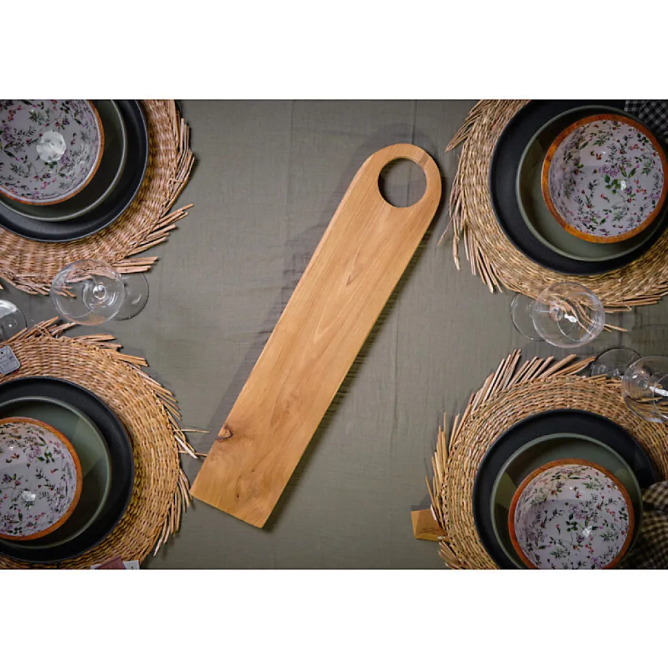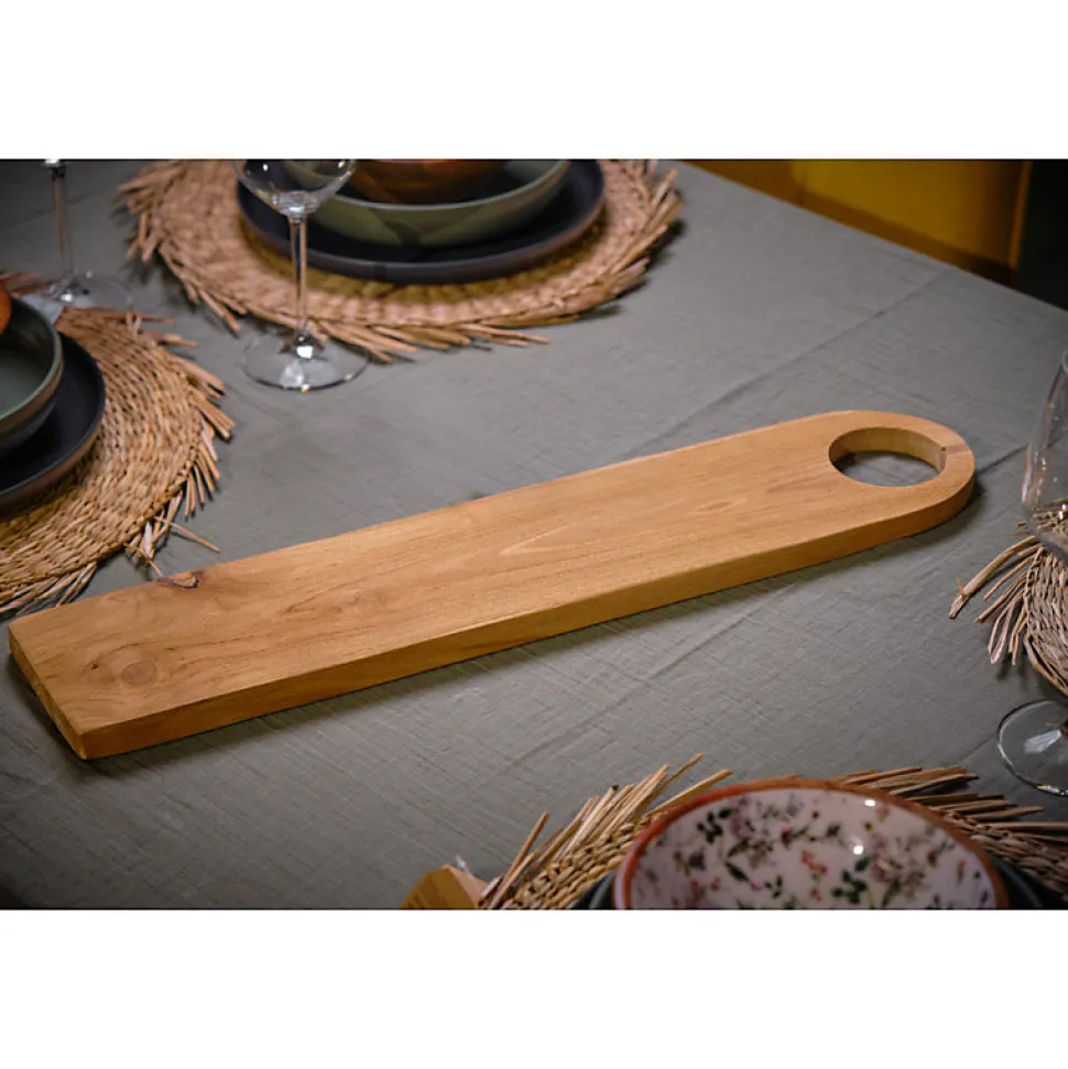 Succombez à la planche à découper longue STELLAR. Découvrez cette planche à découper unique taillée à partir de bois de teck de façon artisanale. Son bout arrondi associé à la finesse du bois en font un accessoire essentiel pour vos soirées en famille ou entre amis. Ne soyez pas limité dans vos besoins, la planche pouvant également servir comme plateau de présentation pour vos repas et apéros sur lequel vous pouvez déposer fromages divers, crudités et amuses-bouches variés, ainsi que comme planche à pain. Vous trouverez le trou taillé dans la planche pratique pour la suspendre dans votre cuisine et ainsi optimiser de l’espace. Le bois de teck est un matériau exotique précieux et résistant. En raison de sa fabrication artisanale, il est possible que le produit soit différent de celui présenté sur les photos, autant par sa forme que par sa couleur. Caractéristiques : Planche à découper longue STELLAR. COULEUR : Bois. COMPOSITION : Bois de teck. TECK : Un bois exotique précieux, résistant et imputrescible. Son grain est serré et fin. Une caractéristique unique fait que le teck ne provoque pas de corrosion ni d’oxydation du métal à son contact. La couleur du bois varie de jaune pâle à bronze ou beige rougeâtre au veinage sombre. DIMENSIONS APPROXIMATIVES : Épaisseur 2 cm x longueur 61 cm x profondeur 12 cm. ATTENTION : En raison de son caractère artisanal et unique, la couleur et l’aspect du bois peuvent varier par rapport au produit présenté sur la photo. ENTRETIEN : Nettoyer délicatement avec un chiffon doux et eau savonneuse. Ne pas utiliser de produits ou accessoires abrasifs. Utiliser des produits adaptés à la nature du bois. Il est déconseillé de mettre la planche au lave-vaisselle. 1 Colis : 0.5 kg.