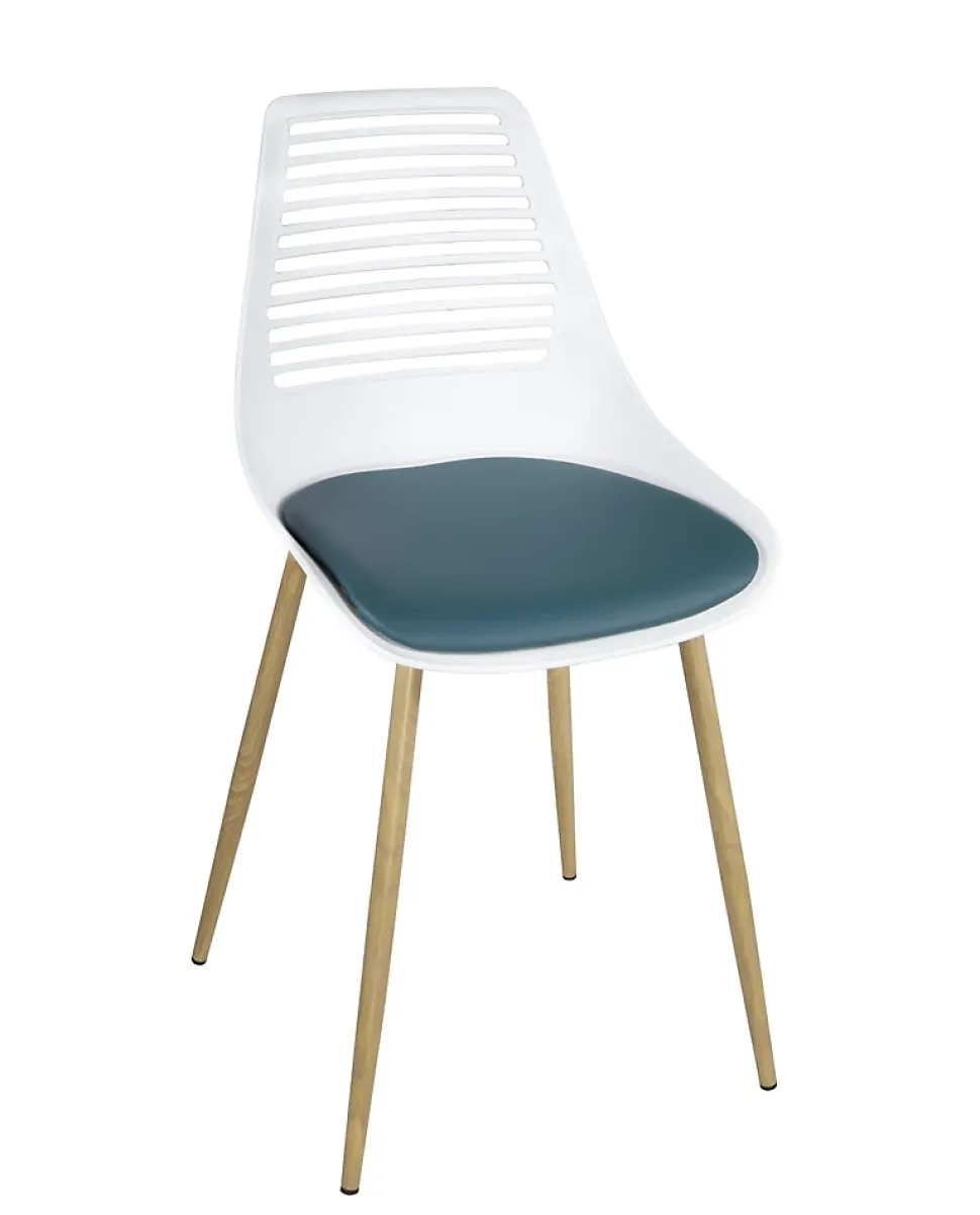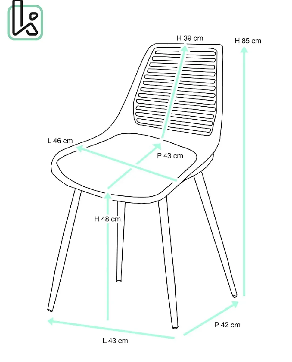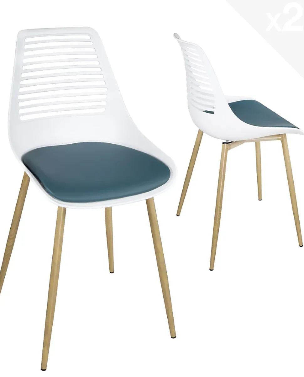 Lot de 2 chaises rétro geos. Une chaise de cuisine aux lignes vintage inspirées des années 60 avec son dossier ajouré et son coussin simili cuir intégré. Large siège ergonomique en polypropylène résistant et facile à entretenir, pieds en métal imitation bois pour une stabilité et une solidité à toutes épreuves. Une chaise de cuisine idéale pour réunir autour de votre table toute la famille au quotidien ! matières: – siège en polypropylène avec coussin fixe habillé de simili cuir et rembourré – piètement en métal finition transfert imitation bois- patins en plastique (protège vos sols) fiche technique : – hauteur totale : 85 cm – assise / dossier : 46 (l) x 43 (p) x 39 (h) cm – hauteur d’assise : +/- 48 cm – dimensions hors tout : 46 x 56 x 85 cm – colisage : livré en 1 colis de 56 x 48 x 62 cm – nombre de pièces par carton : 2 – poids brut d’un carton : 11,1 kg – poids net d’une chaise : 4,5 kg montage : – facileentretien : – chiffon doux légèrement humide