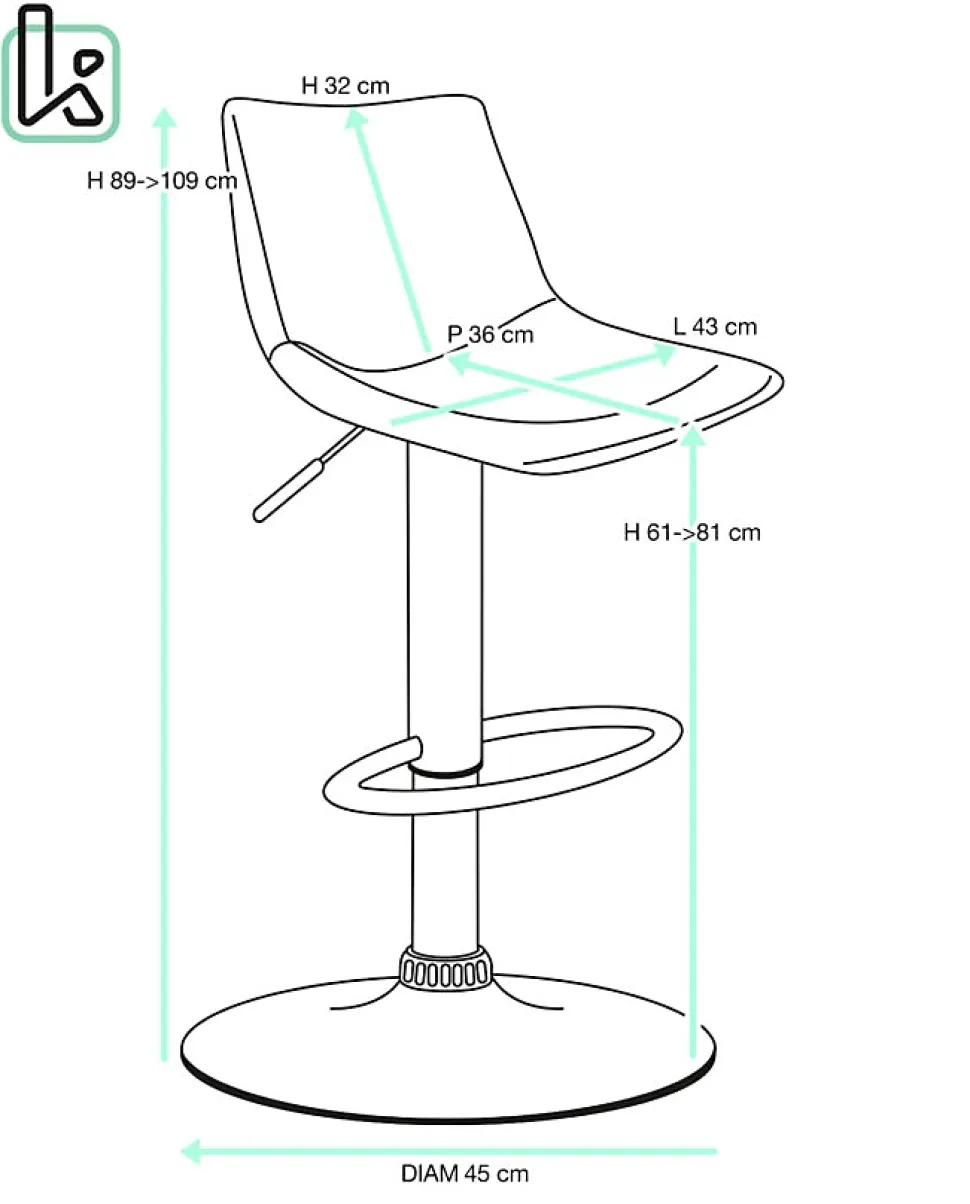 - Hauteur d’assise réglable de 61 à 82 cm, pivotant à 360°, socle de 45 cm de diamètre