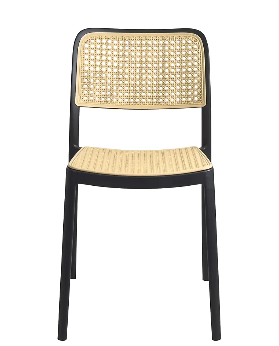 Apportez une touche rétro chic à votre intérieur avec ce lot de deux chaises noir et beige empilables. Mariant le style du rotin classique à la solidité d’une structure en plastique renforcé, ces chaises sont parfaites pour la cuisine, la salle à manger ou un restaurant tendance. Leur design ajouré offre confort et légèreté, tout en assurant une excellente durabilité au quotidien.✔ Ces chaises s’empilent facilement, un vrai plus pour les espaces restreints ou les établissements professionnels. Quand chaque mètre carré compte, elles offrent une solution pratique sans compromettre le style.✔ Profitez du charme du rotin naturel sans les inconvénients ! Leur assise et dossier ajourés en imitation rotin ajoutent une touche bohème et légère, parfaite pour une ambiance chaleureuse et conviviale.✔ Cuisine, salon, salle à manger ou même restaurant : leur design universel s’adapte partout. Leur ligne sobre et élégante en fait un choix idéal pour tout type de déco, du contemporain au rétro.✔ Fabriquées en plastique haute qualité, ces chaises résistent aux chocs, aux taches et au temps. Un choix fiable pour une utilisation quotidienne, aussi bien en usage domestique que professionnel.✔ Faciles à déplacer, elles sont légères sans compromettre leur stabilité. Leur structure noire mate offre une belle présence visuelle, tout en garantissant un confort solide à chaque assise.Matières :chaise en PP (Polypropylène)insert dossier et assise en imitation rotinépaisseur piètement : 3 cmpatins plastique transparent anti rayures (Protège vos sols)Fiche technique :dimensions hors tout : 47 (L) x 55 (P) x 81 (H) cmhauteur totale : +/- 81 cmhauteur d’assise : +/- 46 cmassise : 41 (L) x 44 (P) cmdossier : 44 (L) x 39 (H) cmcolisage : livré en 1 colis de 60 (L) x 50 (P) x 88 (H) cmnombre de pièces par carton : 2poids brut : 10.70 kgpoids net d’une chaise : 4.40 kg