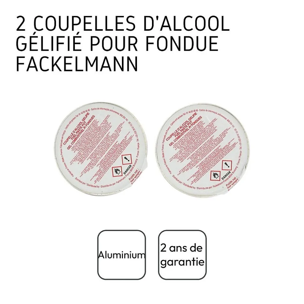 DESCRIPTION : Lot de 2 coupelles d’alcool gélifié pour faire une fondue savoyardeLE PETIT + : Les coupelles d’alcool gélifié sont parfaites pour faire une fondue !COMPOSITION : Alcool, aluminiumDIMENSIONS : 9 cmCONTENU : 2 coupelles d’alcool gélifiéCe lot est composé de deux coupelles d’alcool gélifié pour réaliser de la fondue bourguignonne ou de la fondue savoyarde. Vous pouvez aussi faire de la fondue au chocolat pour un goûter ou un anniversaire !Fackelmann France est une entreprise spécialisée dans la distribution d’ustensiles de cuisine et de pâtisserie ainsi que de moules à gâteaux et de plaques de cuisson. L’entreprise tente d’apporter une certaine facilité dans la façon de cuisiner de chacun grâce à ses ustensiles malins.Les ustensiles de cuisine de Fackelmann France sont proposés à tous les profils de cuisiniers pour une utilisation simple et quotidienne. Les fouets, spatules, louches, éplucheurs, planches à découper et bien d’autres sont à votre portée afin de préparer de délicieuses recettes toujours plus originales.