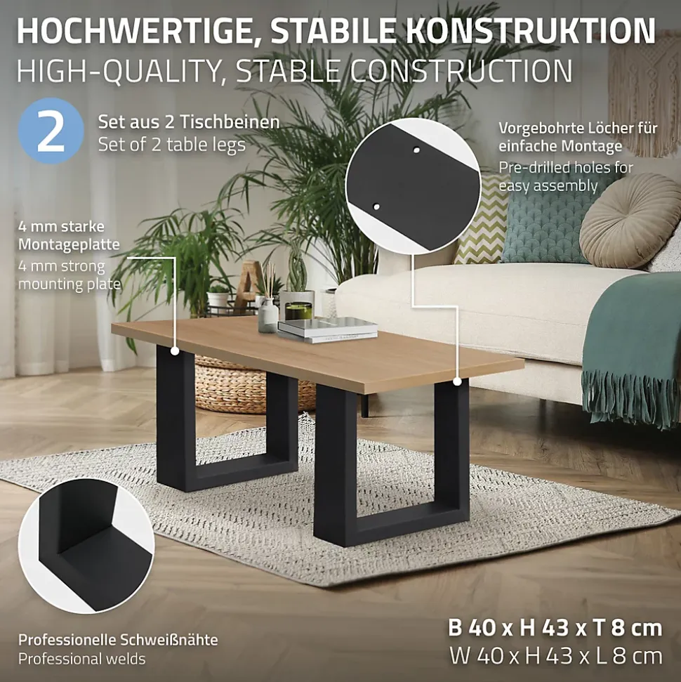 Description:Donnez à votre table une touche industrielle avec ces chemins de table de ECD Germany. Les pieds de table s’adaptent parfaitement comme base de table dans la cuisine, pour la table à manger ou le bureau. Ils sont faits de fer plat d’environ 4 mm d’épaisseur et de solides profils carrés. L’ensemble de la construction est non seulement stable, mais aussi très esthétique. Afin de garantir une stabilité à 100 %, nous recommandons toujours d’utiliser au moins 2 chemins de table (1 paire). Les pieds de table ECD Germany sont parfaitement adaptés aux plateaux de table en divers matériaux, tels que le bois, le plastique, la pierre, etc.Les pieds de table du site ECD Germany vous aideront également à réaliser vos projets de bricolage : Cela vous permettra de donner rapidement et facilement une nouvelle vie à vos vieux meubles et de les transformer en meubles design originaux !Caractéristiques :Dimensions : environ 40 x 43 cmL’optique est captivée par un revêtement de poudre noire.Les pieds en métal sont fournis dans un jeu de 2Pied de table de haute qualité – durable et facile à nettoyerApplication universellePour la cuisine, le salon, le bureau et bien plus encoreTrès résistantForme rectangulaireUn design moderne et intemporelY compris 4 patins de solÉtendue de la prestation :2 x pieds de table 40 x 43 cm en acier thermolaqué4 x glissières de sol