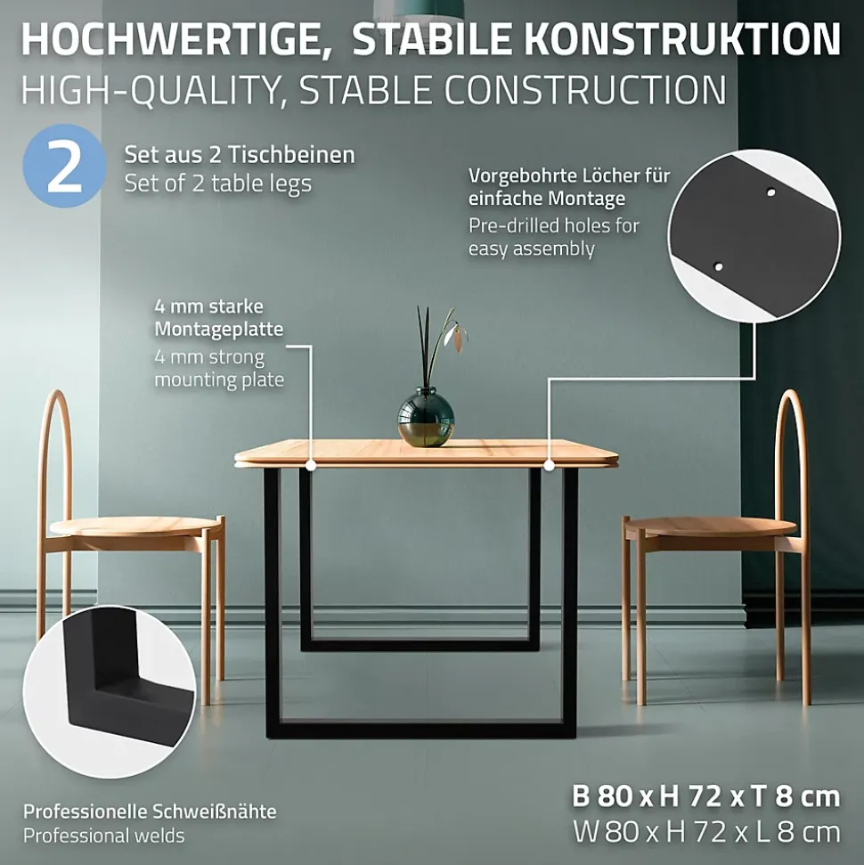 Livraison:2x pieds de table 80 x 72 cm en acier thermolaqué4x protecteurs de solInformation technique:Matériau : acier revêtu de poudreCouleur : noirPoints de montage : 2×6 trousDimensions (LxH) : environ 80 x 72 cmÉpaisseur de la plaque de montage : environ 4 mmÉpaisseur du tube profilé : environ 1 mmDimensions du tube du profil : environ 8 x 4 cmÉpaisseur : environ 0,45 mmPoids par. pieds : environ 5,3 kgCaractéristiques:Dimensions : environ 80 x 72 cmL’optique est captivée par un revêtement de poudre noire.Les pieds en métal sont fournis dans un jeu de 2Pied de table de haute qualité – durable et facile à nettoyerApplication universellePour la cuisine, le salon, le bureau et bien plus encoreTrès résistantForme rectangulaireUn design moderne et intemporelY compris 4 patins de solDescription:Avec ces chemins de table de ECD Germany, votre table prend un caractère industriel. Les pieds de table s’adaptent parfaitement comme base de table dans la cuisine, pour la table à manger ou le bureau. Ils sont faits de fer plat d’environ 4 mm d’épaisseur et de profils carrés stables. L’ensemble de la construction est non seulement stable, mais aussi très esthétique. Pour garantir une stabilité à 100 %, nous recommandons de toujours utiliser au moins 2 chemins de table (1 paire). Les pieds de table ECD Germany sont parfaitement adaptés aux plateaux de table en divers matériaux, tels que le bois, le plastique, la pierre, etc.Les pieds de table de ECD Germany vous aideront également à réaliser vos projets de bricolage : Cela vous permet de donner rapidement et facilement une nouvelle vie à vos vieux meubles et de les transformer en meubles design originaux !