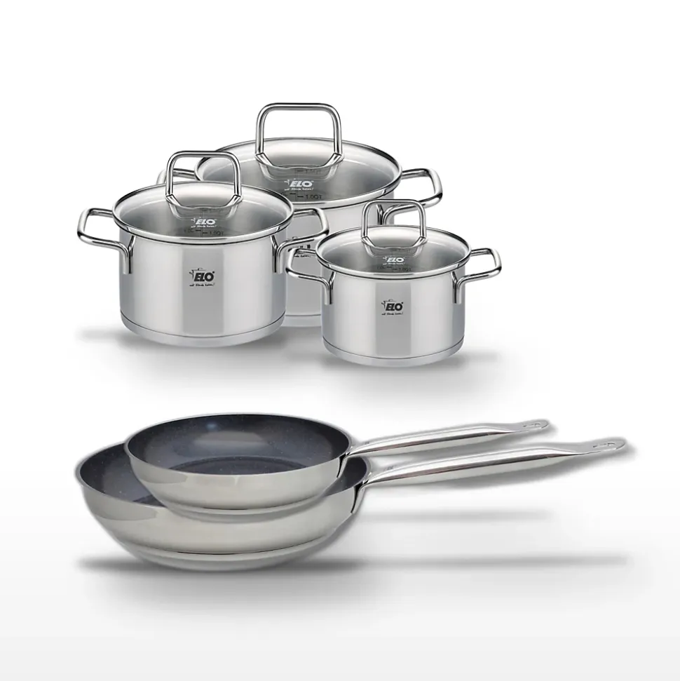 - DESCRIPTION: Un lot complet pour une cuisine optimale, comprenant deux poêles en céramique sans PFAS et trois faitouts en inox, tous de la marque Elo.
