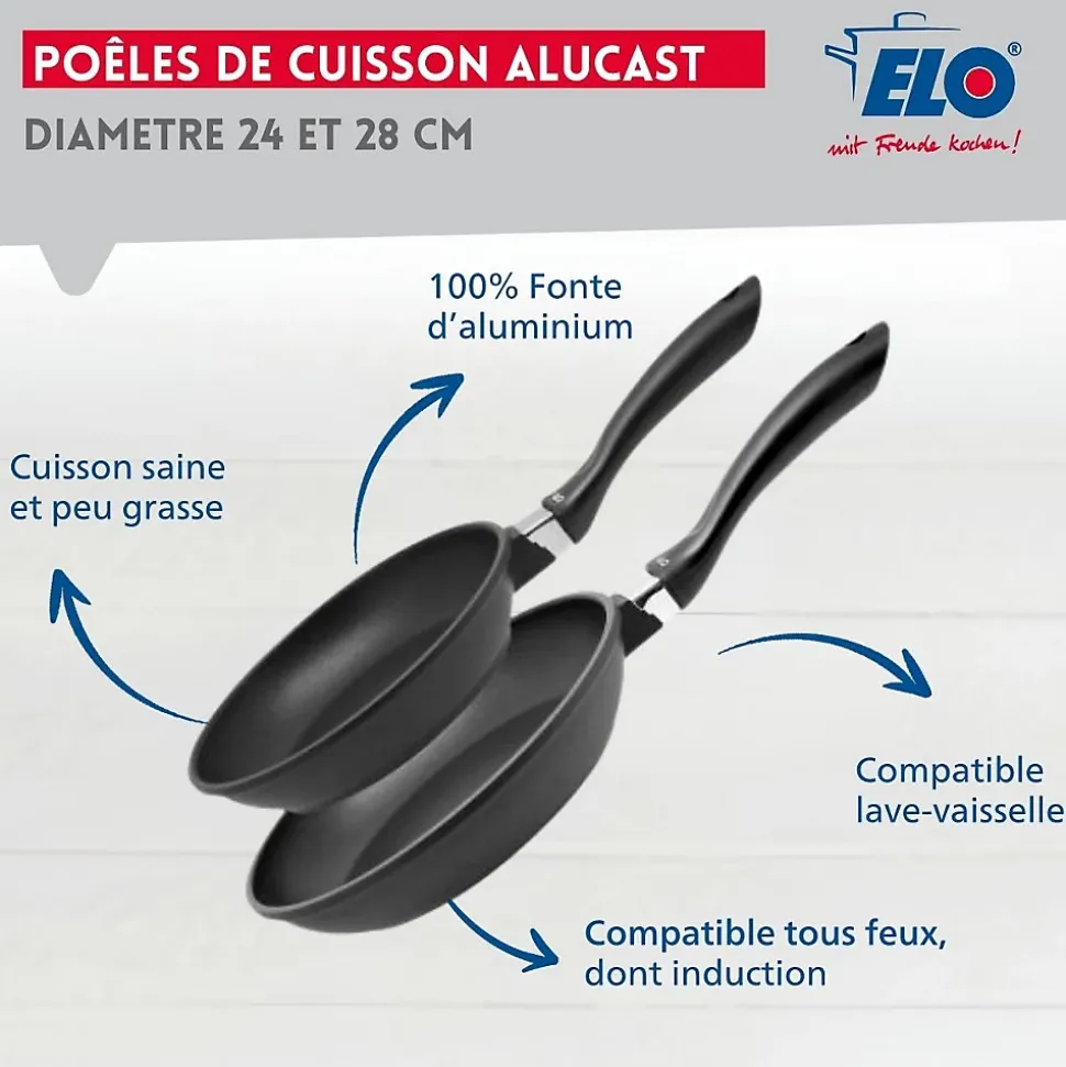 DESCRIPTION : Elo vous propose ce lot de 2 poêles à frire de 24 et 28 cm de diamètre parfaite pour faire mijoter tous vos plats en limitant les matières grasses pour cuisiner sainementLE PETIT + : Cet ensemble de poêles à frire propose une bonne conduction de la chaleur et sont parfaites pour faire revenir votre portion de légumes ou cuisiner toutes vos envies et rendant vos plats plus sains tout en préservant les saveursCOMPOSITION : Les poêles sont en fonte d’aluminium avec un revêtement antiadhérent en céramique sans PFAS qui n’accroche pas les aliments dans la poêle induction et qui facilite le nettoyageDIMENSIONS : Les deux poêles à frire ont des diamètres de 24 cm et 28 cm, ce qui est parfait pour cuisiner différents aliments en même tempsUTILISATION : Que vous souhaitiez préparer de délicieuses omelettes, saisir des steaks juteux ou faire revenir des légumes croquants, les poêles à frire seront vos alliées indispensablesElo est une marque allemande qui propose des produits de cuisson de très haute qualité. Forte de ses récompenses en Allemagne, la marque a décidé de s’implanter sur le marché français à travers Fackelmann France. Les ustensiles de cuisson proposés par Elo sont des casseroles, des poêles, des woks, des couvercles, des marmites, etc.Les ustensiles de cuisson d’Elo sont fabriqués dans matériaux différents avec des revêtements différents mais ils sont tous de très bonne qualité. L’innovation étant également au cœur de la stratégie de la marque, Elo propose un moyen de doser l’huile de cuisson parfaitement grâce aux deux cercles dessinés au fond des poêles et des casseroles.