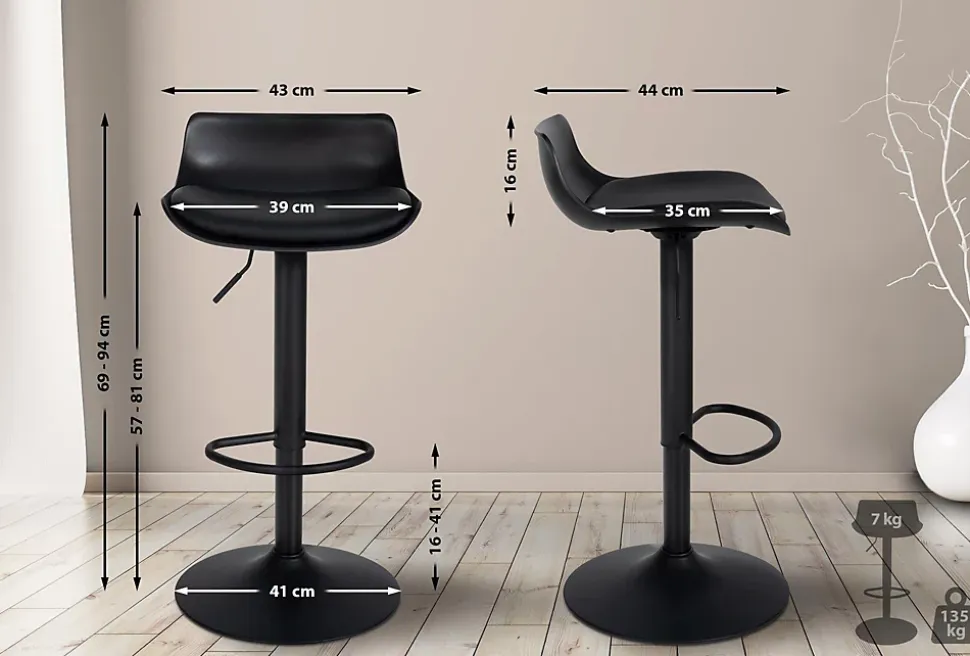 Set de 2 tabourets de bar Aveiro similicuirCes tabourets de bar convainquent par leur conception intelligente. Ils ont été réduits à l’essentiel sans compromettre le confort d’assise. La coque d’assise incurvée est en similicuir et offre une expérience d’assise agréable. Les tabourets de comptoir sont réglables en hauteur à l’aide d’un lift à gaz et peuvent être tournés à 360 degrés. Un repose-pieds qui se règle de manière synchrone avec l’assise permet de rester assis confortablement pendant plusieurs heures. Le design est complété par un pied trompette en métal qui garantit la stabilité de la chaise de comptoir. Le sol est protégé par un protège-sol afin d’éviter les rayures et les dommages.Détails:Hauteur totale : 69 – 94 cmLargeur totale : 43 cmProfondeur totale : 44 cmHauteur d’assise : 57 – 81 cmSurface d’assise (l x p) : 39 x 35 cmHauteur du repose-pied : 16 41 cmHauteur du dossier : 16 cmMax. Capacité de charge : 136 kgPoids : 7 kgComposition du matériau : 100% polypropylèneAssise:Matériau : similicuirRéglable en hauteurAssise pivotante à 360°Piétement:Pied trompette incl. Protecteur de solMatériau : métalPied confortable en forme d’arcSpécificités:Extrêmement facile à nettoyerStabilité sûreLignes clairesConseils d’entretien :Essuyer les salissures légères avec un chiffon en coton humidePour le nettoyage des surfaces métalliques, une solution de rinçage douce suffit généralementNe passer l’aspirateur qu’avec un accessoire approprié.