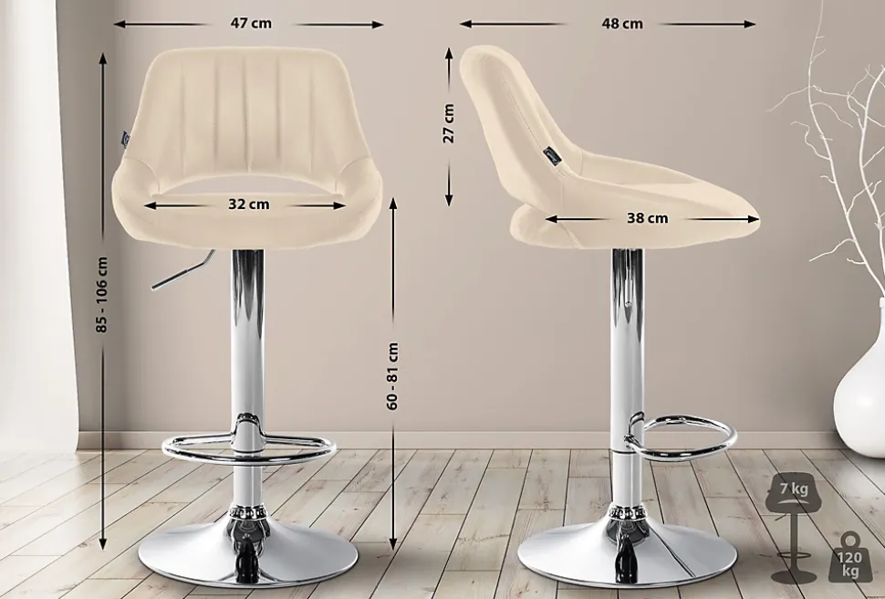 Set de 2 tabourets de bar Milet similicuirLe tabouret de bar Milet se distingue par sa structure métallique robuste qui assure sa stabilité. La hauteur d’assise est réglable de manière flexible pour permettre une adaptation optimale à la hauteur de la table, tandis que la fonction de rotation à 360 degrés permet une utilisation polyvalente. Grâce à son revêtement en similicuir, la chaise de bar est facile à nettoyer et ne nécessite que très peu d’entretien. Une assise confortable, complétée par un dossier ergonomique et un repose-pieds pratique, favorise une position assise saine. Adapté à une utilisation dans divers environnements tels que les cuisines et les bars, le tabouret s’intègre parfaitement dans différents styles d’aménagement.Composition du matériau : 100% polyuréthaneCa. Dimensions:Hauteur totale : 85 – 106 cmLargeur totale : 47 cmProfondeur totale : 48 cmHauteur d’assise : 60 – 81 cmAssise (LxP) : 32 x 38 cmHauteur du dossier : 27 cmMax. Capacité de charge : 120 kgPoids : 7 kgAssise:Matériau : similicuirRéglable en hauteurAssise pivotante à 360°Piétement:Matériau : métalPied trompette incl. Protecteur de solRepose-pieds confortable en forme d’arcSpécificités:Surfaces faciles d’entretienStabilité sûreLignes clairesConseils d’entretien:Essuyer les salissures légères avec un chiffon en coton humidePour le nettoyage des surfaces métalliques, une solution de rinçage douce suffit généralementNe passer l’aspirateur qu’avec un accessoire approprié