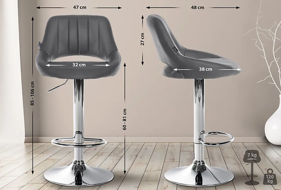 Lot de 2 tabourets de bar Milet similicuir, Chaise de bar pivotante avec repose-pieds et dossier Métalchromé/Gris
