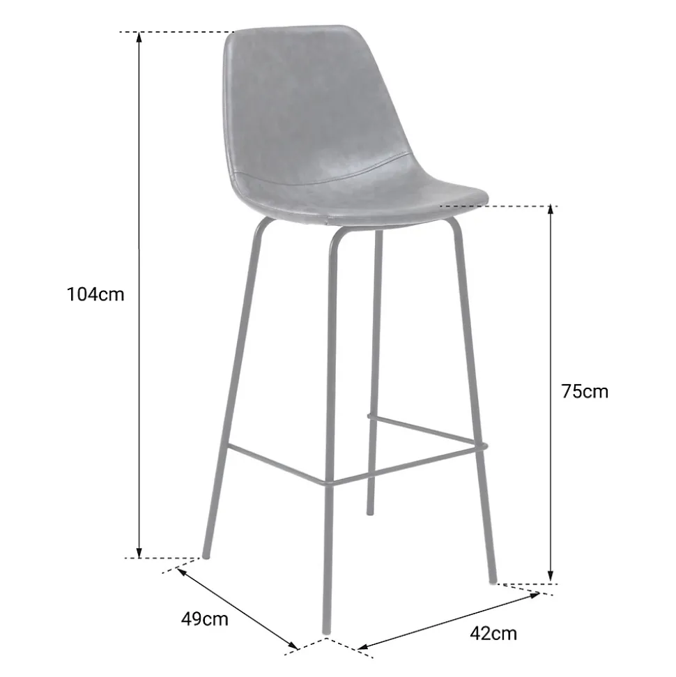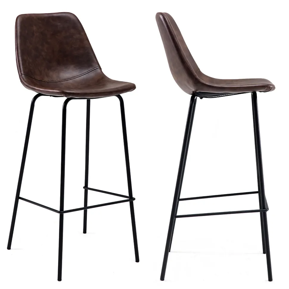 Style rétro chaleureux : Le revêtement en simili associé à une structure en métal noir confère un charme vintage authentique à ce duo de tabourets., Confort durable et bien pensé : Grâce à une large assise enveloppante et un repose-pieds intégré, ces tabourets offrent un confort optimal pour les moments prolongés au bar ou à la table haute., Solidité fiable : Grâce à une structure métallique robuste, chaque tabouret supporte jusqu’à 130 kg pour un usage fiable au quotidien.