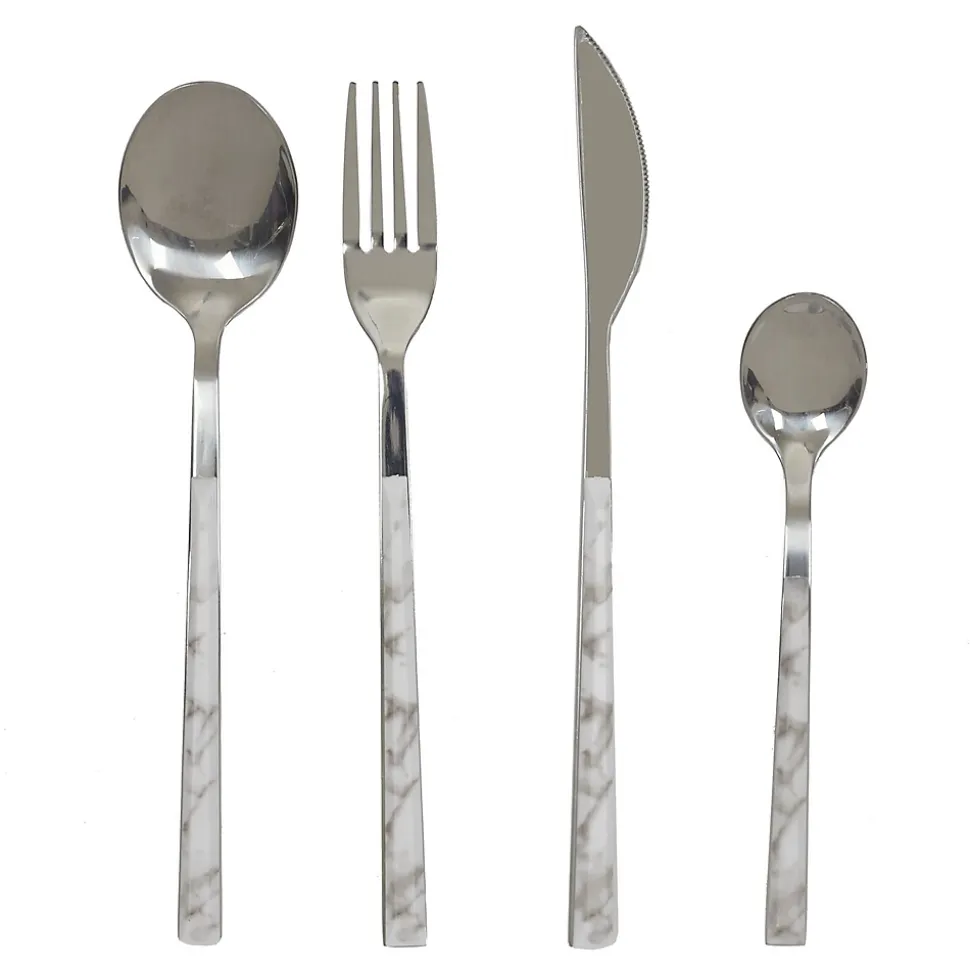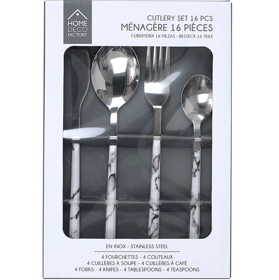 Ce lot de 3 jolies ménagères, chacune de 16 couverts noir et blanc, sera du plus bel effet sur vos tablées. Elle contient : 12 fourchettes, 12 couteaux, 12 cuillères à soupe et 12 cuillères à café.FICHE TECHNIQUE- Lot de 3 Ménagères.- Matière : en acier Inoxydable.- Matière des manches : Plastique – PP.- Kit de 48 pièces contenant 12 couteaux, 12 fourchettes, 12 cuillères et 12 cuillères à café.- Détails : Effet Marbre.- Couleur : Blanc et Noir.- Compatible lavage en Lave-Vaisselle.CARACTERISTIQUES TECHNIQUES- Dimensions d’une ménagère : Longueur 25 cm x Hauteur 4,5 cm x Profondeur 14 cm.- Poids d’une ménagère : 0,500 Kg.