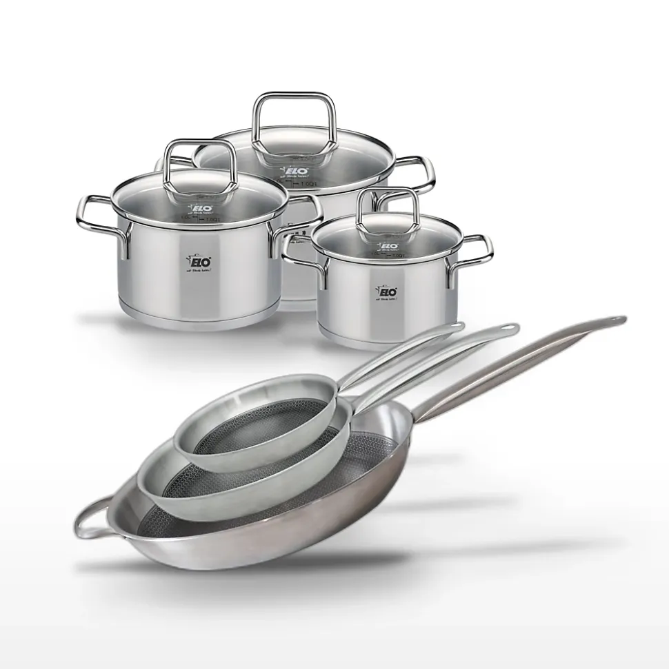 DESCRIPTION : DESCRIPTION : Lot Elo avec 3 poêles Relief Solution de 32/28/24 cm et 3 faitouts Citrin de 12/14/16 cm, pour une cuisine polyvalente.PETIT + : PETIT + : Revêtement antiadhésif ELODUR Select sans PFAS pour une cuisson saine et un nettoyage facile.COMPOSITION : COMPOSITION : Poêles en acier inoxydable 18/10 et aluminium ; faitouts en acier inoxydable avec couvercles en verre.DIMENSIONS : DIMENSIONS : Poêles de 32/28/24 cm et faitouts de 12/14/16 cm, adaptés pour 2 à 6 personnes.UTILISATION : UTILISATION : Compatibles tous feux, induction incluse, et passent au four jusqu’à 240°C pour des recettes variées.ENTRETIEN : ENTRETIEN : Nettoyage facile avec une éponge douce, les faitouts passent au lave-vaisselle.Ce lot Elo, idéal pour les professionnels de la cuisine et les amateurs exigeants, combine l’innovation et la qualité des collections Relief Solution et Citrin. Les poêles en acier inoxydable 18/10, avec leur revêtement antiadhésif ELODUR Select sans PFAS, garantissent une cuisson homogène et saine. Les faitouts Citrin, avec leur fond capsulé, préservent les vitamines de vos aliments tout en optimisant la consommation d’énergie. Chaque pièce est conçue pour une compatibilité tous feux, y compris induction, et résiste à des températures de four allant jusqu’à 240°C. Le design moderne et fonctionnel des poêles, avec leur bord verseur et manche creux, offre une prise en main confortable et élégante. Les faitouts, accompagnés de couvercles en verre, permettent une cuisson maîtrisée. Le nettoyage est simplifié grâce au revêtement des poêles et au passage au lave-vaisselle des faitouts. Ce lot est un investissement sûr pour une cuisine performante et esthétique, soutenu par la garantie de qualité Elo.