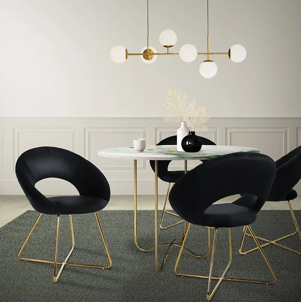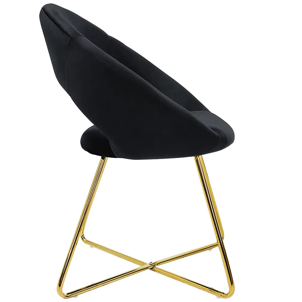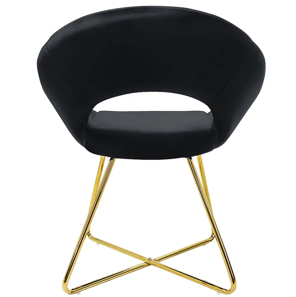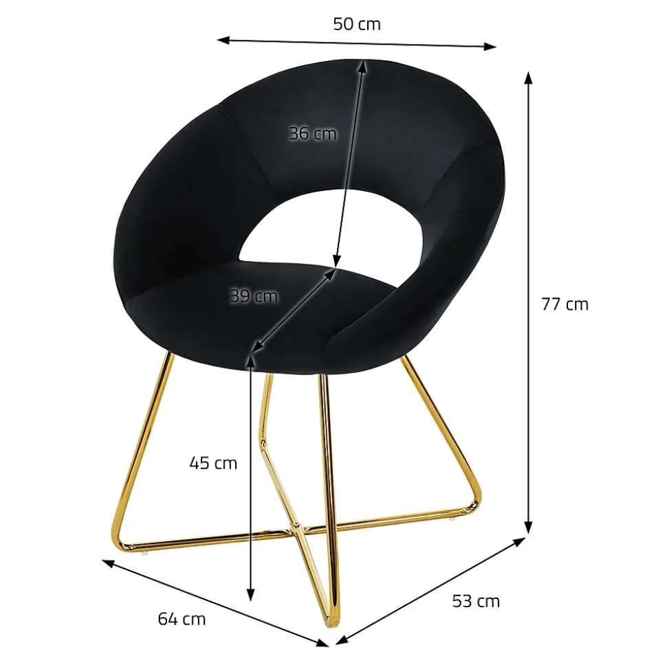 Description du produit:Découvrez l’alliance ultime de l’élégance et du design contemporain avec notre chaise de salle à manger à la structure métallique dorée et à l’assise en velours. Nous associons des matériaux de qualité à un dossier en demi-coque accueillant pour ajouter une touche de sophistication à votre salle à manger.Le fauteuil en velours est un complément polyvalent et attrayant. Fabriqué en velours rembourré, il est doté de pieds en fer dorés. La combinaison du velours et de l’or est la plus intéressante de la saison : un must absolu. Le fauteuil a des lignes douces et un rembourrage qui assure un confort d’assise maximal. Renouvelez votre salon avec ce fauteuil ou placez-le dans votre bureau pour une touche d’élégance.Notre structure en métal doré n’est pas seulement synonyme de stabilité et de durabilité, elle met également le fauteuil en scène de manière glamour. La couleur dorée s’intègre harmonieusement dans différents styles d’intérieur, du moderne au classique.Le revêtement velouté de l’assise procure une sensation de douceur et de confort incomparable. La texture noble du velours confère à la chaise une touche de luxe et en fait le point central de votre salle à manger. L’assise généreusement dimensionnée garantit un confort optimal, que ce soit lors de longs repas ou de réunions conviviales.Livraison:4 x Chaise de salle à manger de ML-DesignInformation technique:Matériau de la housse : veloursCouleur de la housse : noirMatériau du piètement : métalCouleur du piètement : orHauteur d’assise : 45 cmProfondeur d’assise : 39 cmHauteur du dossier : 36 cmLongueur du dossier : 50 cmLongueur x largeur x hauteur : 64 cm x 53 cm x 77 cmÉpaisseur des pieds : 1,6 cmCapacité maximale de charge : 120 kgPoids : 5,8 kg / pièce