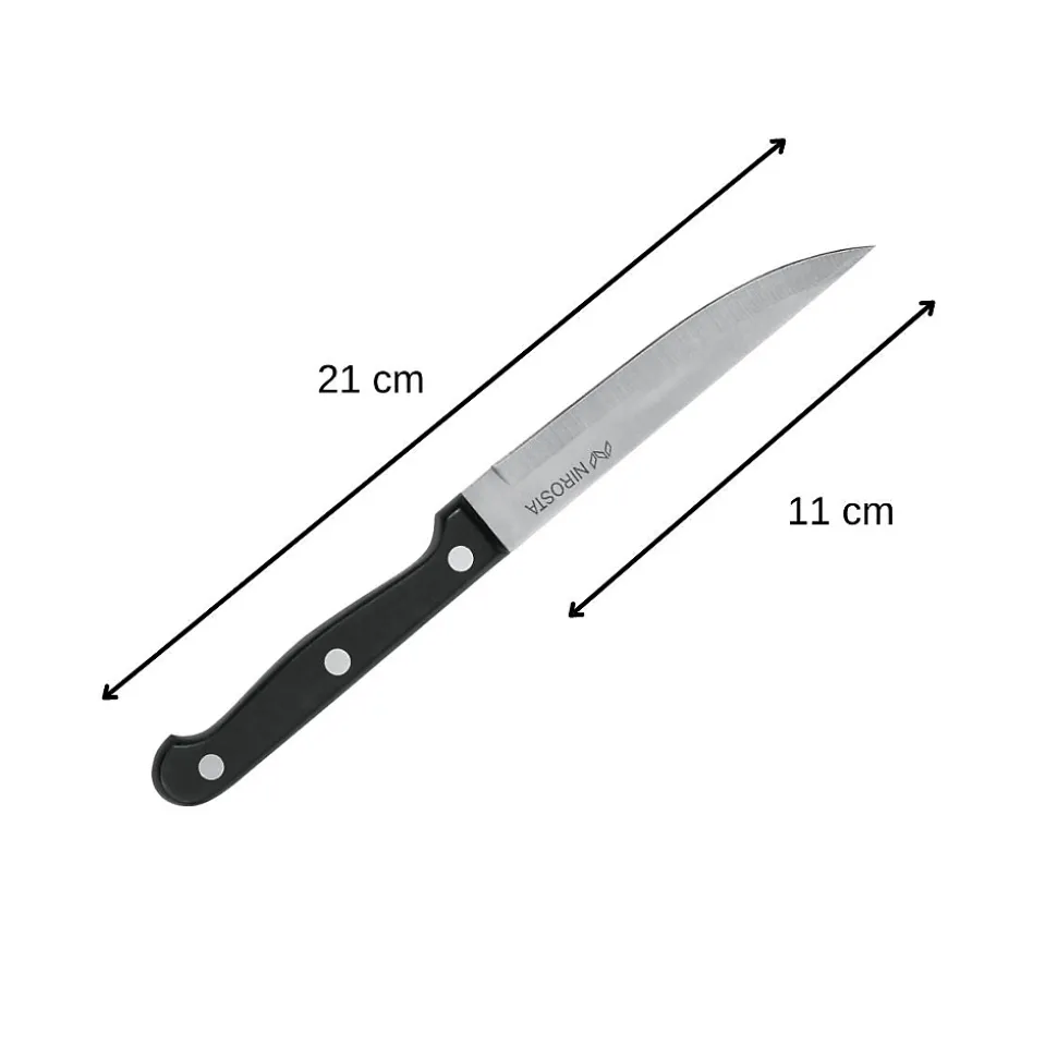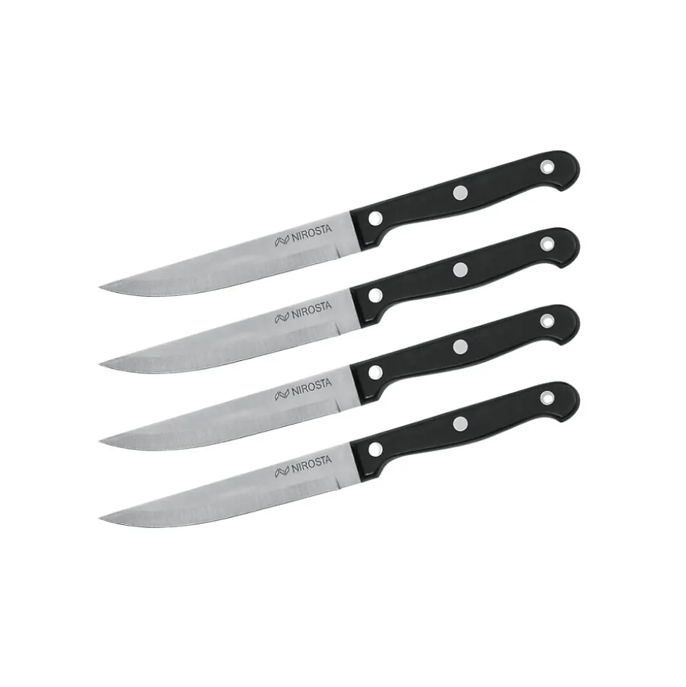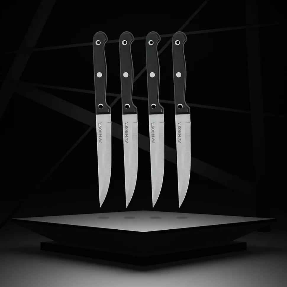 Lot de 4 couteaux à steak NIROSTA Mega — longueur totale 21 cm, lame inox 11,5 cm, manche ergonomique noir en POM avec trou de suspension. Idéaux pour steaks, pizzas et découpe générale; usage domestique et professionnel. Lavage à la main recommandé pour préserver la lame.
