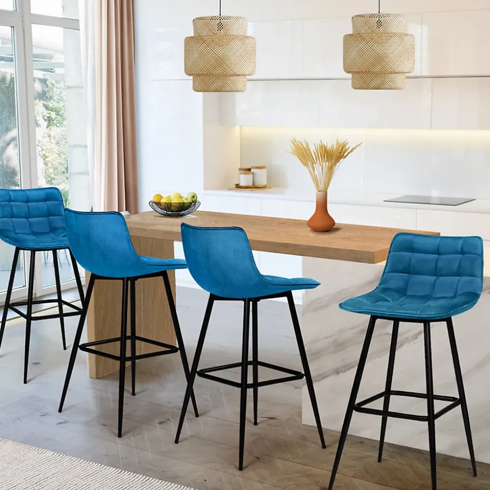 Aménagez votre cuisine, salle à manger, coin repas avec ce superbe lot de 4 tabourets MADY coloris bleu. Avec cet ensemble moderne et cosy, vous apporterez une touche tendance à votre intérieur. Leur coloris bleu s’accordera facilement avec tous les styles de décoration. Dotés d’une assise moelleuse ils vous permettront d’être confortablement installé pendant vos repas en famille ou entre amis. Les tabourets au revêtement en tissu velours apporteront confort et douceur.Les 4 pieds en métal noir mat assurent robustesse et stabilité, tout en accentuant le design moderne et tendance de ces tabourets de bar.Grâce à leur style design, vous pourrez les placer dans la pièce de votre choix : autour de votre îlot central dans votre cuisine ou le long de votre bar. Profitez également d’un élément de décoration à petit prix, de quoi apporter modernité et design sans vous ruiner. L’association du tissu velours bleu et des pieds en métal noir offre aux tabourets un esprit très tendance.Profitez de leur petit prix pour moderniser votre intérieur !Dimensions des tabourets MADY bleuDimensions globales : Longueur 39 x largeur 45 x Hauteur 88 cmDimensions de l’assise : L. 39 x l. 35 x H. 65 cm Matériaux : revêtement en velours et pieds en métal noir matColoris : bleu Vendus en lot de 4À monter soi-même