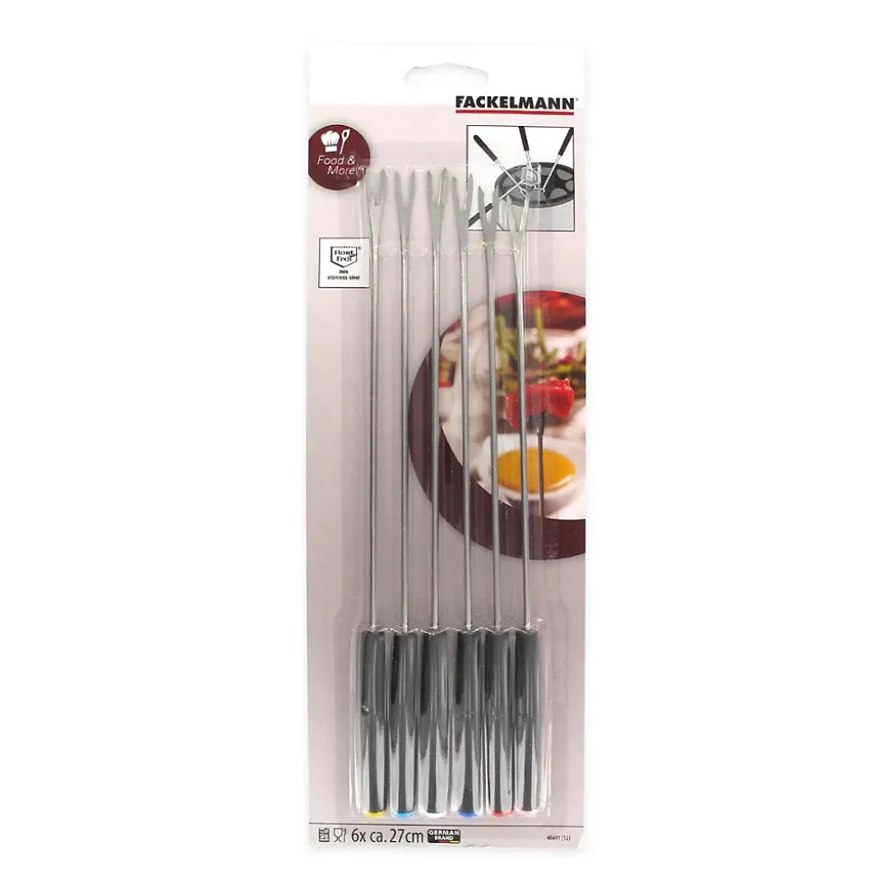 LE PETIT + : Ces piques à fondue bourguignonne ou savoyarde sont pratique pour accrocher un morceau de viande ou de pain et le tremper dans le vin ou le fromageCOMPOSITION : Acier inoxydable, plastiqueDIMENSIONS : 27 cmCONTENU : 6 pics à fondue savoyardeCe lot d’ustensiles de cuisine est composé de six fourchettes à fondue savoyarde ou à fondue bourguignonne avec des boules de couleur au bout du pique. Chaque pique à fondue mesure 27 cm de long et possède deux dents au bout afin de piquer le bout de viande, de poisson ou de pain que vous allez ensuite tremper dans le fromage, l’huile ou le bouillon.La fondue bourguignonne consiste à plonger de la viande et notamment du bœuf dans un bouillon d’huile chaude assaisonner souvent de vin et d’herbes aromatiques. Vous pouvez aussi plonger de la volaille et d’autres viandes et aliments.La fondue savoyarde est un peu différente puisqu’elle consiste à plonger du pain très dur dans un mélange de vin blanc et de quatre fromages savoyards avec de la crème ou d’autres assaisonnement selon votre recette.Ces piques à fondue sont donc parfaits à utiliser dans les deux cas, mais attention, ne perdez le bout de viande ou de pain dans le bol de bouillon sinon vous aurez un gage !Fackelmann France est une entreprise spécialisée dans la distribution d’ustensiles de cuisine et de pâtisserie ainsi que de moules à gâteaux et de plaques de cuisson. L’entreprise tente d’apporter une certaine facilité dans la façon de cuisiner de chacun grâce à ses ustensiles malins.Les ustensiles de cuisine de Fackelmann France sont proposés à tous les profils de cuisiniers pour une utilisation simple et quotidienne. Les fouets, spatules, louches, éplucheurs, planches à découper et bien d’autres sont à votre portée afin de préparer de délicieuses recettes toujours plus originales.