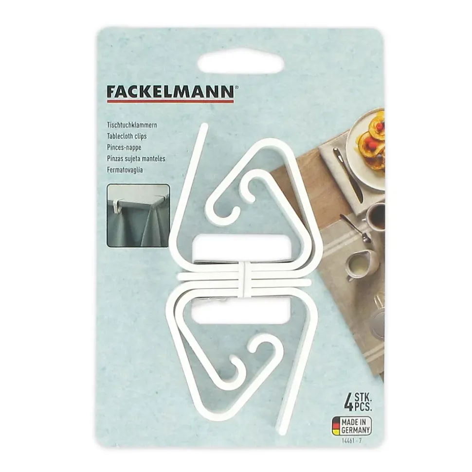- DESCRIPTION : Fackelmann vous propose ce lot de 8 pinces à nappe pour ajuster la nappe à la hauteur de la table afin que la nappe ne s’envole pas durant le repas