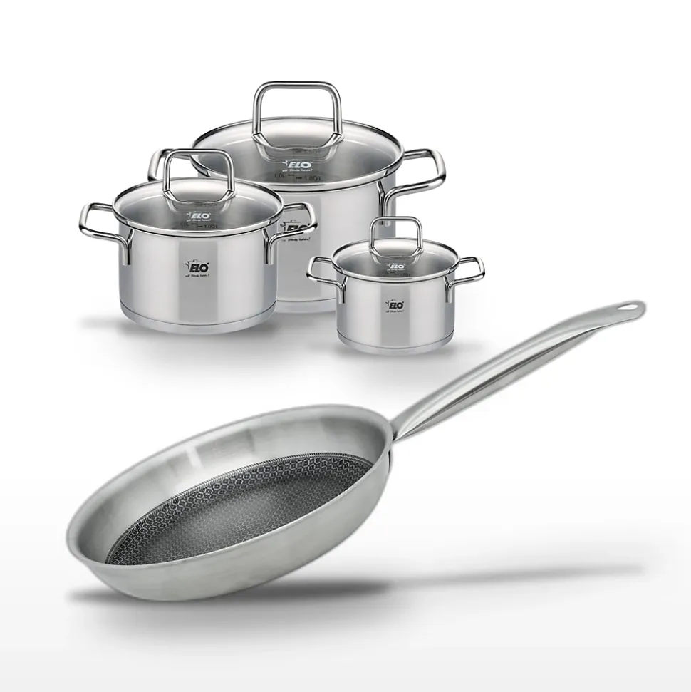 DESCRIPTION : DESCRIPTION : Ensemble Elo Relief Solution avec 3 faitouts en inox et une poêle 28 cm, pour une cuisine variée et efficace.PETIT + : PETIT + : Les faitouts disposent d’un fond capsulé pour une cuisson économe en énergie et préservant les vitamines.COMPOSITION : COMPOSITION : Acier inoxydable et verre pour les faitouts, acier inoxydable 18/10 et aluminium pour la poêle.DIMENSIONS : DIMENSIONS : Faitouts de 12 cm, 16 cm, et 20 cm. Poêle de 28 cm de diamètre et 5,5 cm de hauteur.UTILISATION : UTILISATION : Compatibles tous feux, y compris induction. La poêle passe au four jusqu’à 240°C.ENTRETIEN : ENTRETIEN : Passe au lave-vaisselle. Nettoyage facile grâce au revêtement antiadhésif de la poêle.Le lot Elo Relief Solution est idéal pour les professionnels de la restauration et les passionnés de cuisine souhaitant allier performance et polyvalence. Les faitouts en inox de 12, 16 et 20 cm sont parfaits pour préparer une variété de plats, des sauces délicates aux légumes mijotés. Leur fond capsulé garantit une répartition uniforme de la chaleur, optimisant ainsi l’efficacité énergétique. La poêle de 28 cm, avec son revêtement antiadhésif ELODUR Select, assure une cuisson sans accrocs et une facilité de nettoyage inégalée. Compatible avec tous les types de feux et résistante au four jusqu’à 240°C, elle répond aux exigences les plus élevées des cuisines modernes. Ce lot est un choix judicieux pour ceux qui recherchent des ustensiles de qualité supérieure, alliant design élégant et fonctionnalité.