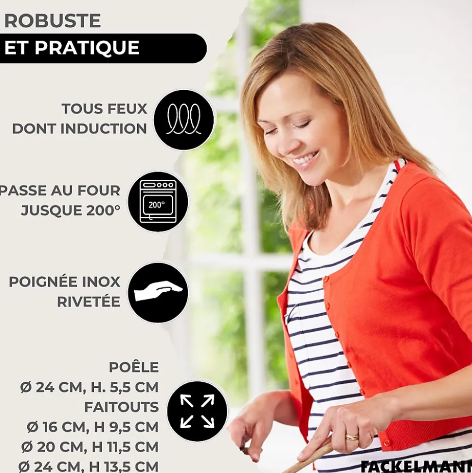 - DIMENSIONS: Poêle Ø 24 cm, faitouts Ø 16/20/24 cm, ustensiles variant de 315 mm à 345 mm de longueur