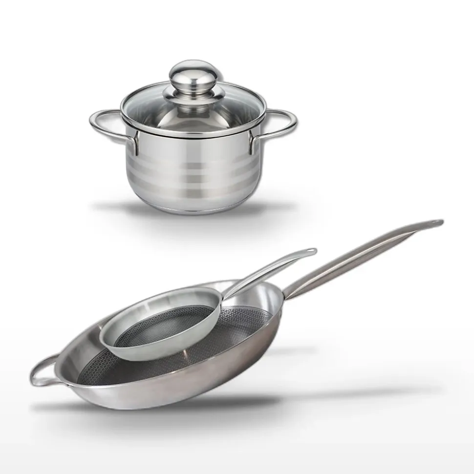 - COMPOSITION: Poêles en acier inoxydable 18/10 avec revêtement ELODUR Select, faitout en inox de haute qualité. Compatibles tous feux.