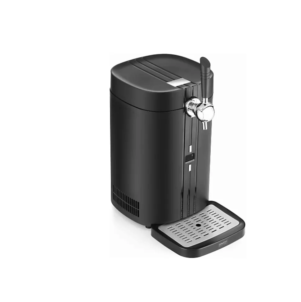 Machine à bière professionnelle Kitchen Chef Distribeer, capacité 5L, température réglable entre 3 et 12°C, puissance 60W, design compact et robuste avec finition inox brossé et noir, pratique pour service au verre grâce à son tiroir récolte goutte amovible et sa poignée ergonomique.