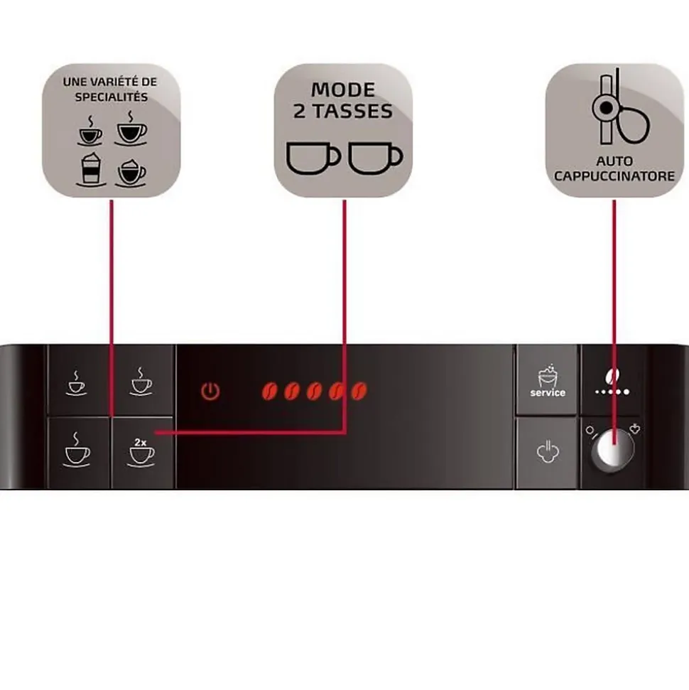 D’une simple pression, la cafetiere a grain Passione OT vous permet de préparer jusqu’a 10 boissons caféinées, en plus du lait chaud, de la mousse de lait ou de l’eau chaude. L’appareil est accompagné d’un réservoir a lait qui vous permet de préparer des spécialités lactées a n’importe quel moment de la journée. Ce réservoir peut etre lavé au lave-vaisselle et rangé au réfrigérateur. La fonction de pré-infusion et d’
