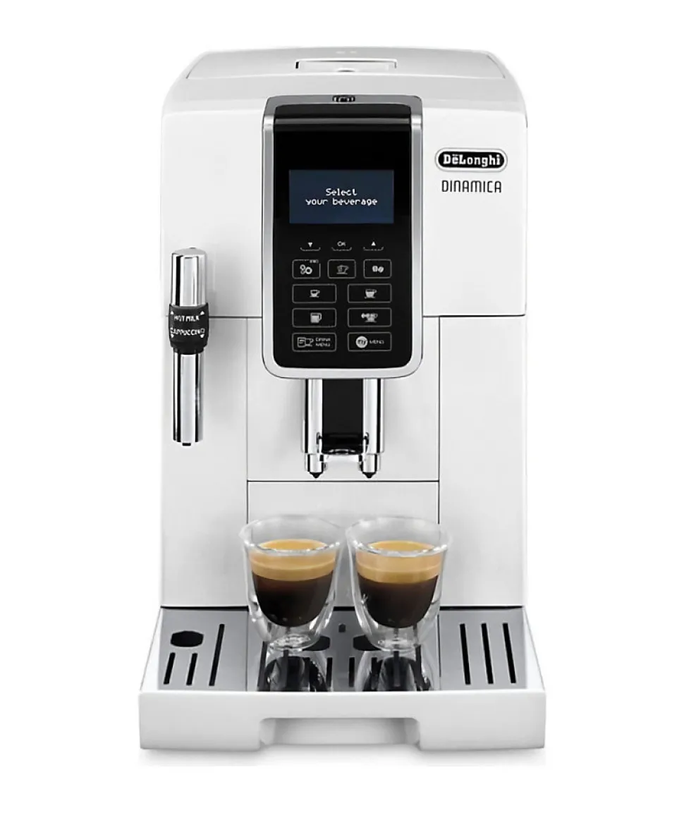 De’Longhi Dinamica ECAM 350.35.W : machine expresso automatique avec broyeur intégré et écran tactile, 4 recettes en accès direct, réservoir grains 300 g, réservoir eau 1,8 L, pression 15 bar, finition glossy white avec accents chrome. Système Thermoblock, pré-infusion, moulin réglable, buse vapeur inox pour cappuccino, double sortie réglable (84–135 mm). Facile d’entretien avec programmes de rinçage et détartrage, filtre à eau inclus.