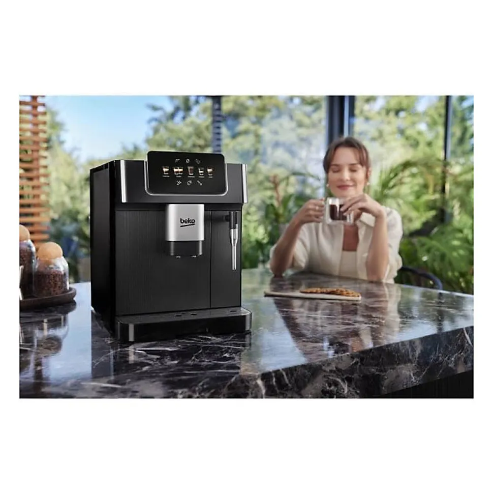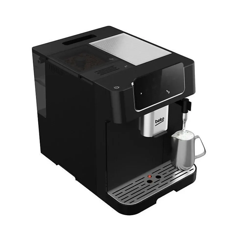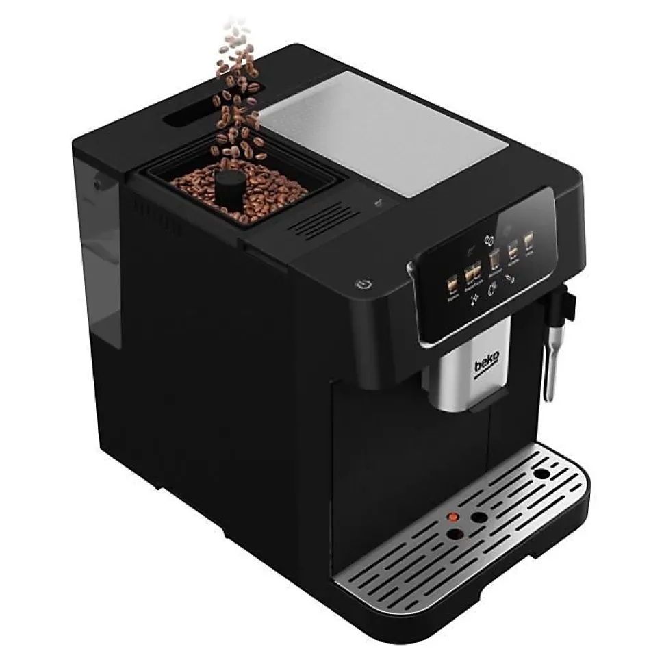 Machine à café automatique BEKO CEG7302B avec broyeur intégré (1350 W, 19 bars). Réservoir d’eau 2 L, conteneur à grains 250 g, écran tactile et 5 options de boissons (Expresso, Americano, Lungo, Ristretto, Doppio). Inclut carafe à lait 0,6 L, buse vapeur latérale, double sortie café, bec ajustable en hauteur, plateau chauffe-tasse, éclairage de la zone de distribution et entretien simplifié (rinçage automatique, parties compatibles lave-vaisselle). Garantie 2 ans.