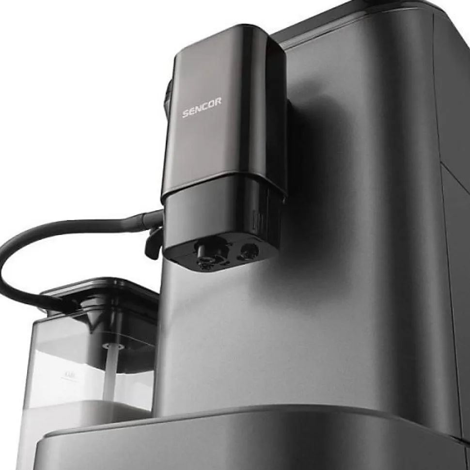 Machine à expresso entièrement automatique Sencor SES 8500BK avec écran TFT, pompe 20 bars, broyeur inox 15 niveaux, réservoir d’eau 1,5 L et réservoir lait 750 ml. Prépare espressos, lungo, cappuccino et latte d’une touche, contrôle via application Wi‑Fi, entretien simplifié avec unités amovibles et programmes d’auto‑nettoyage.