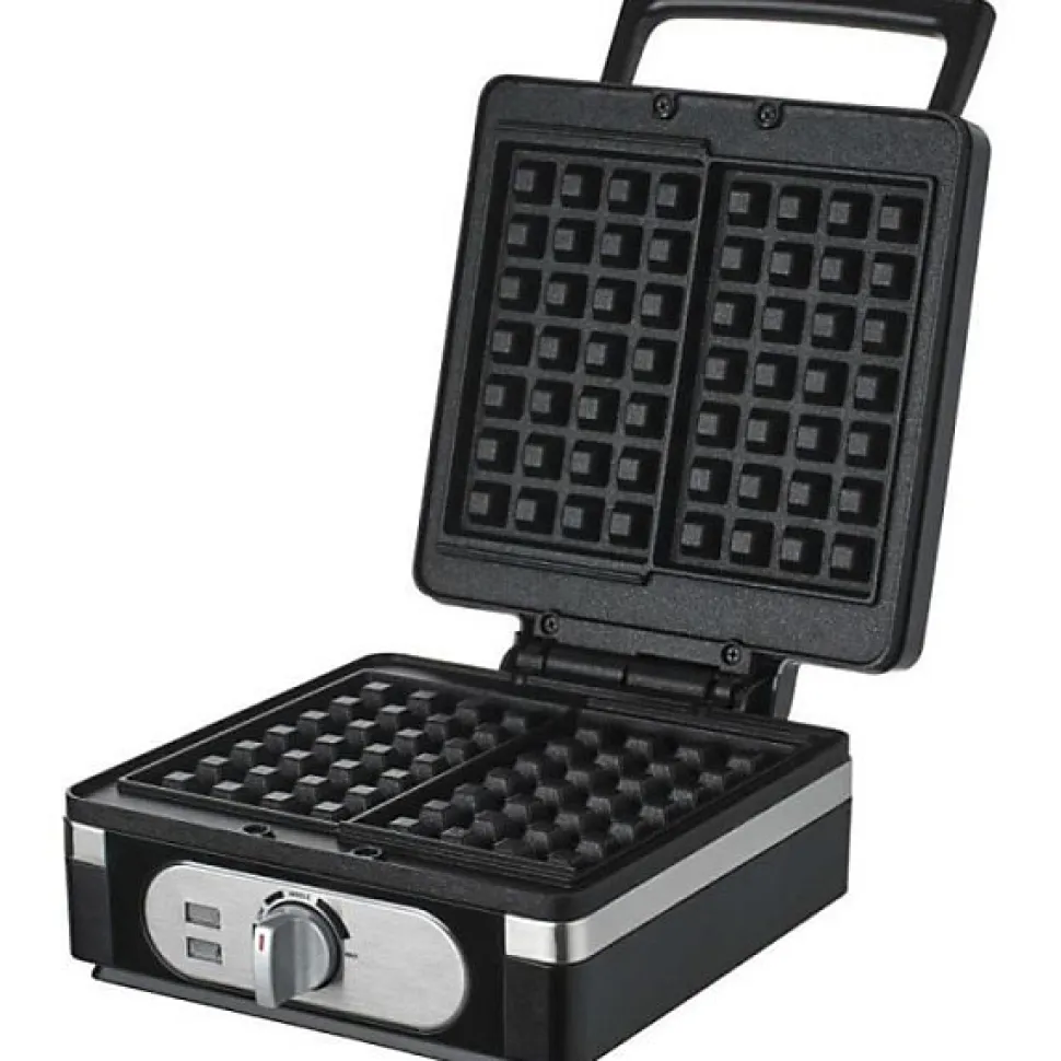 Gaufrier Sencor SWF 2010BK 1400 W noir — prépare 2 gaufres (85 x 145 mm) avec des plaques antiadhésives, thermostat réglable, voyants de cuisson, poignée isolée, fusible thermique et rangement vertical. Compact et facile à entretenir.