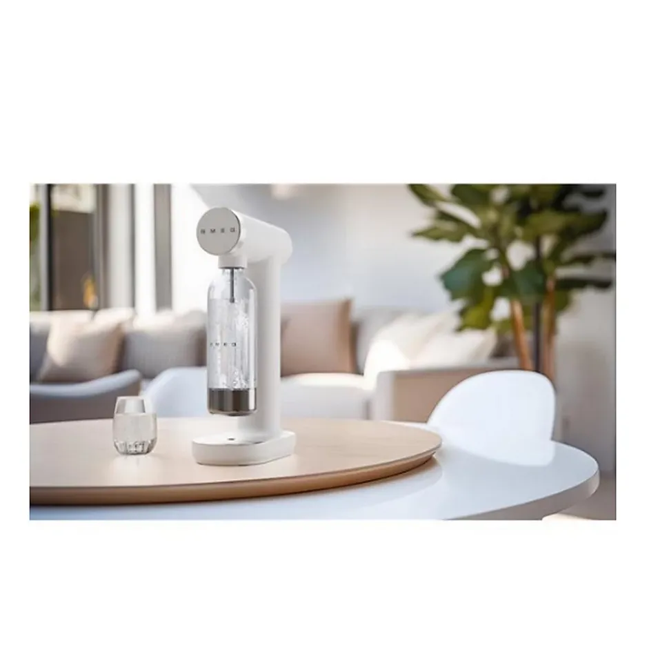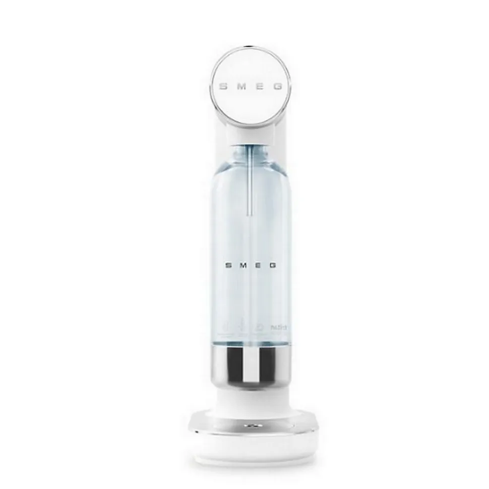 Machine à gazéifier l’eau + 1 bouteille – blanc Smeg – Machine à gazéifier l’eau + 1 bouteille Collezione SKC01WHM de SmegMachine à soda SMEG SKC01BLM élégante et intuitive, cette machine à soda sans électricité vous permet de gazéifier votre eau en toute liberté. Grâce à son fonctionnement manuel par bouton rotatif, ajustez le niveau de gazéification selon vos préférences. Le cylindre de CO2 (non inclus) se visse facilement à l’arrière via un système sécurisé. La bouteille fournie en Tritan Renew, sans BPA et lavable au lave-vaisselle, allie durabilité et praticité. Son design mat blanc avec finitions aluminium brossé et chromé lui confère un style raffiné et contemporain. Stable et compacte, elle trouve aisément sa place sur un plan de travail ou un chariot grâce à sa base antidérapante. Le bac de récupération avec couvercle magnétique assure une utilisation propre. Idéale pour ceux qui veulent réduire leur consommation de bouteilles en plastique tout en personnalisant leur boisson au quotidien. – Type de produit : Machine à gazéfier l’eau.Esthétique : Collezione.Finition : Mat.Matériau du corps : Plastique.Matériau de l’anneau de la manette : Aluminium.Finition de l’anneau de la manette : Satin avec bord chromé.Matériau de la base supérieure : Aluminium.Finition de la base supérieure : Brossé avec bord chromé.Matériau de la bouteille : Plastique en Tritan Renew.Matériau du fond et du bouchon de la bouteille : Inox.Finition du fond de la bouteille et du bouchon : Brillant.Matériau des pieds antidérapants : Silicone.Type de logo : Embouti à partir du moule.Manette Oui.Fente pour l’insertion d’une bouteille de CO2 : Oui.Capacité de la bouteille : 1 litre (800 ml jusqu’à la ligne de remplissage MAX).Bouteille lavable au lave-vaisselle : Oui.Couvercle du bac de récupération : Oui, magnétique.Compatibilité avec le type de bouteille de CO2 : À visser,