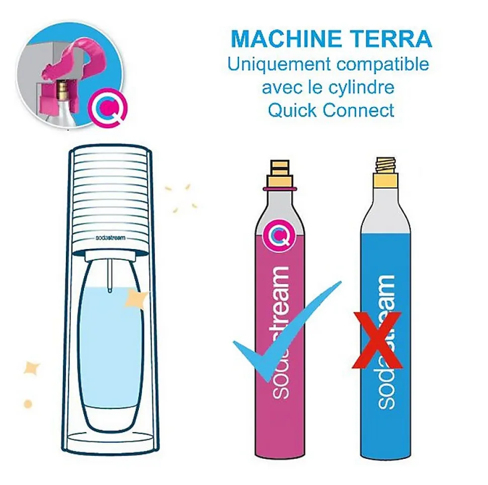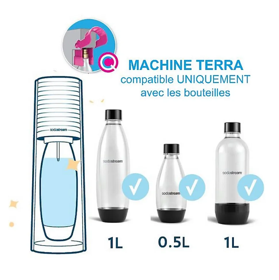 Machine à gazéifier l’eau + 2 bouteilles + 1 cylindre Sodastream – Machine à gazéifier l’eau TERRABILV de Sodastream. Libérez vos bulles en toute simplicité ! Facile à utiliser, cette machine vous invite à partager des moments pétillants ! Faites de l’eau pétillante à volonté et sans effort ! Préparez votre eau gazeuse avec la machine Sodastream, puis aromatisez votre eau gazeuse avec les saveurs Sodastream et dégustez ainsi une délicieuse boisson pétillante à votre goût ! Cette machine vous permettra de réaliser votre eau gazeuse ou vos sodas à partir de l’eau du robinet. Une solution et économique. Simple d’utilisation et facile d’entretien. De l’eau gazeuse en quelques minutes : remplir la bouteille d’eau, positionnez la bouteille sur la machine, appuyer sur le bouton de gazéification, dépressuriser la bouteille : l’eau pétillante est prête ! Une machine compacte avec une belle finition mate et moderne. Encore plus facile à utiliser et intuitive avec la technologie brevetée du Cylindre Quick Connect à clipser : plus besoin de visser le cylindre, il suffit de le clipser ! Le système »Snap & Lock rend l’expérience encore plus agréable : plus besoin de visser la bouteille, en la clipsant simplement, le mécanisme l’aspire pour lui permettre de faire corps avec la machine. – Type de produit : Machine à gazéifier l’eau.Accessoires inclus : 1 cylindre de CO2 Quick Connect pour gazéifier environ 60 litres d’eau du robinet, 2 bouteilles de gazéification 1 L Fuse, réutilisables et compatibles lave-vaisselle.Faible encombrement.Fonctionne sans pile ni électricité.Machine compatible avec toutes les bouteilles PET Sodastream (Bouteilles au format Fuse et Classique).Compatible uniquement avec les cylindres Quick Connect.Coloris : BLanc.Dimensions 13.4 x 19.5 x 42.8 cm.