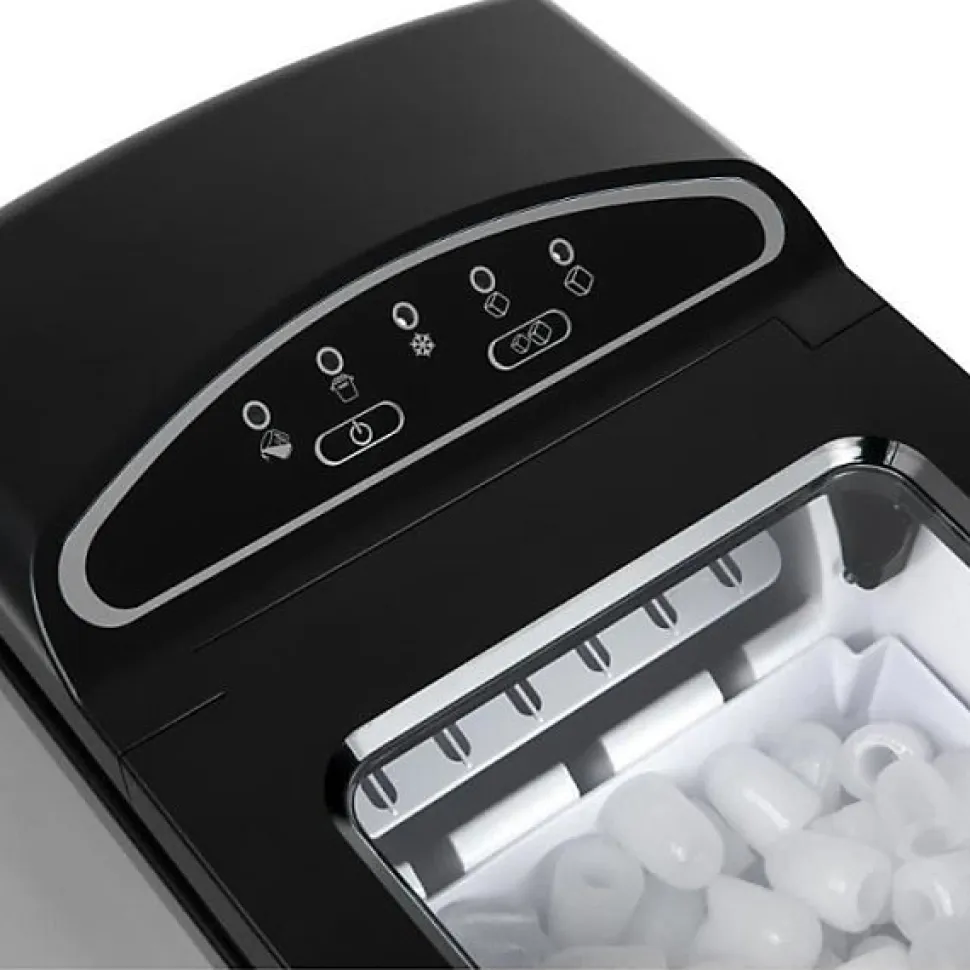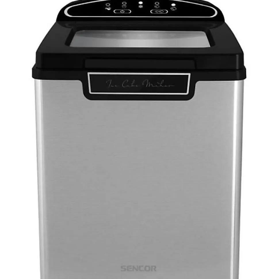 Machine à glaçons compacte Sencor SIM 3500SS : produit jusqu’à 12 kg/jour, glaçons prêts en 9 minutes, réservoir 1,9 L, deux tailles de glaçons, arrêt automatique et fonctionnement silencieux. Idéale pour fêtes, camping, bateau ou petite cuisine.