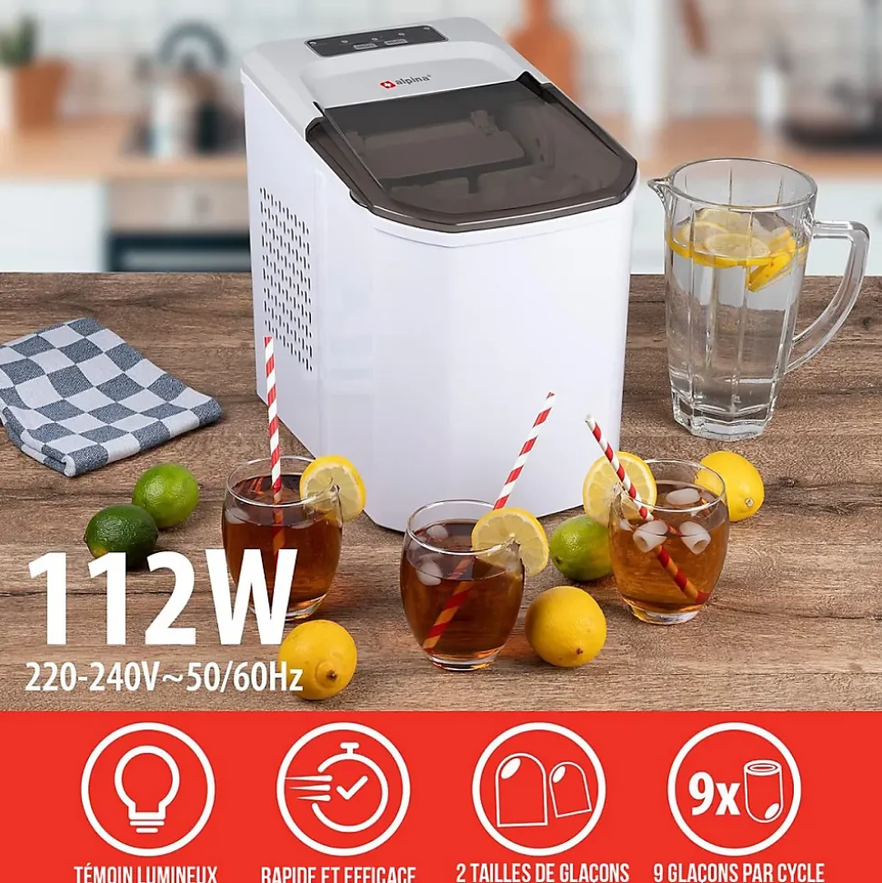 Savourez chaque gorgée de vos boissons préférées avec la Machine à Glaçons Alpina, une solution pratique pour obtenir des glaçons rapidement. Cet appareil à glaçons est parfait pour créer des glaçons de qualité supérieure à la maison. Son design élégant et compact s’intègrera parfaitement dans n’importe quelle cuisine. De plus, la réputation de la marque Alpina en matière de qualité et de durabilité vous garantit un produit fiable et performant.Caractéristiques clés : – 9 Glaçons par cycle en 10 à 12 minutes : Profitez de glaçons en un clin d’œil grâce à la rapidité de la machine Alpina. Assurant une disponibilité constante.- Différents formats de glaçons (S et L) : Personnalisez votre expérience glacée en choisissant entre deux tailles de glaçons. La sélection se fait facilement sur le dessus de la machine à l’aide d’un réglage intuitif.- Affichage LED : L’affichage LED sur le dessus de la machine simplifie votre expérience. Choisissez la taille des glaçons, vérifiez l’état de fonctionnement, et soyez informé quand les glaçons sont prêts ou si de l’eau doit être ajoutée.- Couvercle transparent : Surveillez le processus de fabrication des glaçons grâce au couvercle transparent.Avec la machine à glaçons Alpina, vous n’aurez plus jamais à vous soucier de manquer de glaçons lors de vos fêtes ou de vos moments de détente à la maison.Caractéristiques techniques : – Puissance: 112W.- Capacité: 12-15kg/24 heures.- Capacité en eau: 1,25L.- 9 glaçons par cycle.- Volume du bac à glace: 0,5 kg.- Bac à glace amovible.- Pelle à glaçons incluse. – Alimentation électrique: 230V.- Fréquence: 50-60Hz.- Dimensions : 32 x 23.5 x 32.5 cm. – Poids 7.3 kg.