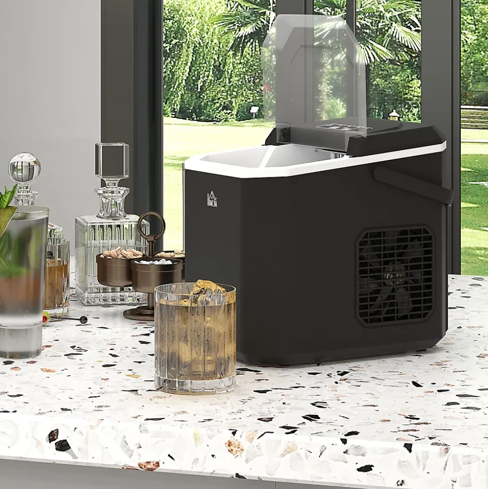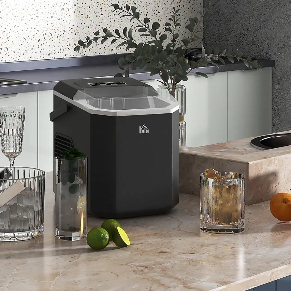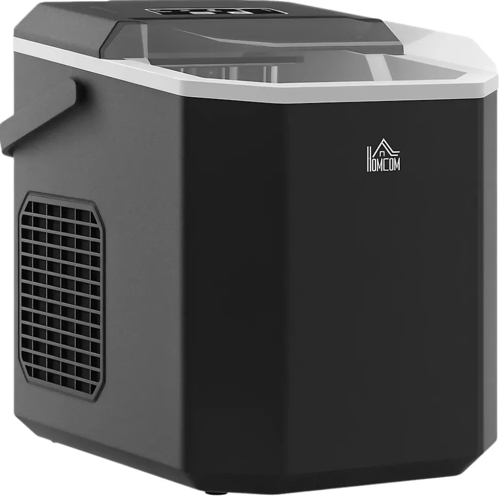 Lancez tout événement en plein air avec cette machine à glace HOMCOM ! Capable de produire 12 kg de glace par jour et 9 cubes toutes les 6 à 13 minutes, elle répondra parfaitement à vos besoins. Avec sa fonction d’autonettoyage et son fonctionnement silencieux, elle est l’accessoire idéal pour toutes vos boissons.Caractéristiques :- Le système de refroidissement à air assure à la machine à glaçons une production rapide de glace- La machine à glaçons produit 12 kg de glace par jour, 9 glaçons toutes les 6-13 minutes- 2 tailles de cubes de glace- L’indicateur lumineux de la machine à glaçons pour la maison signale le fonctionnement et les rappels (manque d’eau et bac à glace plein)- Machine à glaçons compacte avec la poignée de transport pour améliorer sa fonctionnalité- Machine a glaçons professionnelle avec panier et pelle inclus- Le trou de drainage permet une élimination rapide de l’eau et un nettoyage facile- Montage non nécessaireSpécifications :- Couleur : noir- Matériel : PP, cuivre- Dimensions totales : 22,2L x 29,4P x 29H cm- Production de glace : 12 kg/jour, 9 pièces/6-13 minutes- Réfrigérant : R600a- Temps de production première : 6-9 min (température ambiante : 25?, température de l’eau : 13?)- Volume du réservoir d’eau : 1,3L- Capacité du réservoir : 1,2L, stockage de glace : 0,6 kg- Tension : AC 220-240V 50Hz- Puissance : 230V (nominale), 105W (production de glace), 120W (dégel)- Câble d’alimentation : 1,5 m- Niveau sonore maximum : – Réf. : 800-185V90BK- Note : les glaçons ne doivent pas être laissés longtemps dans la machine à glace