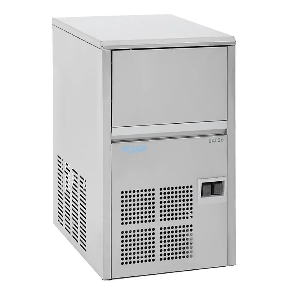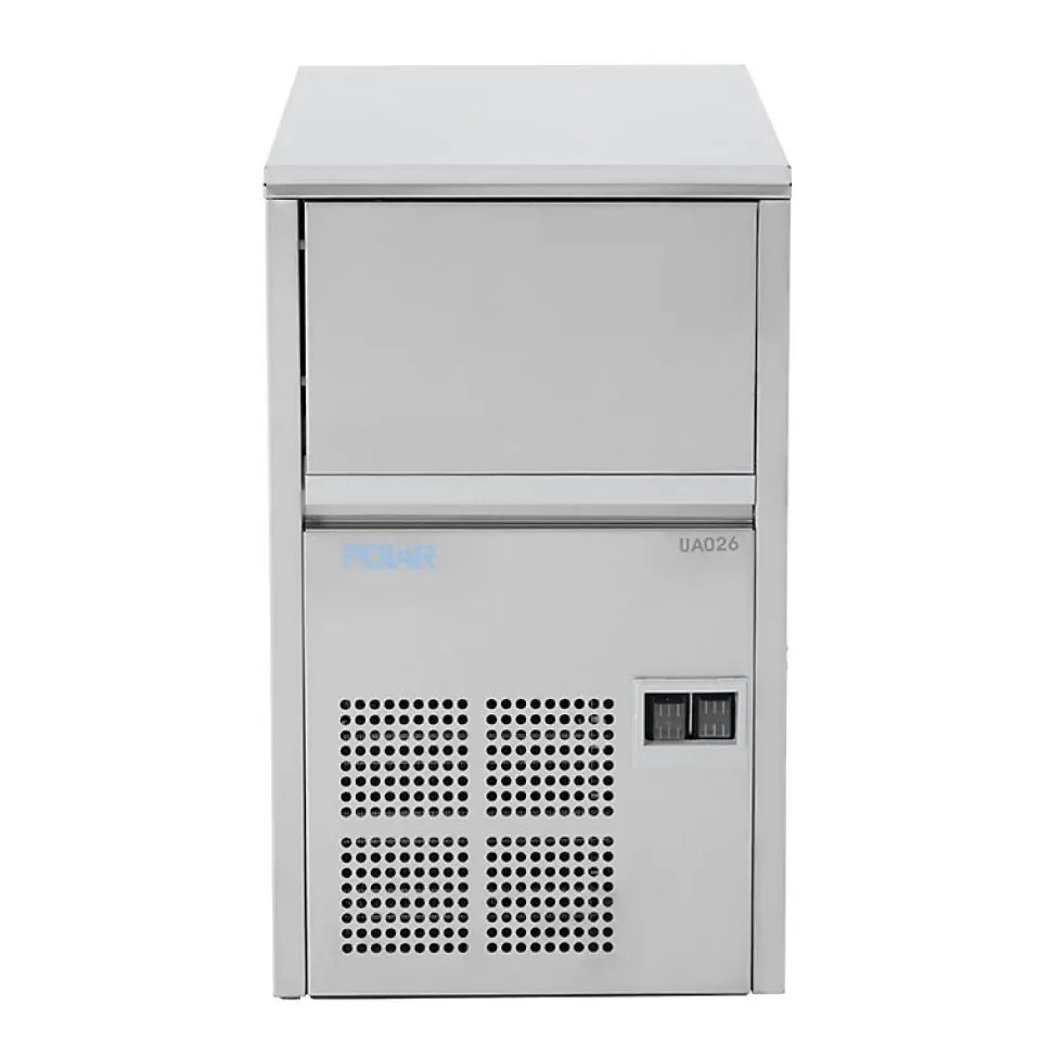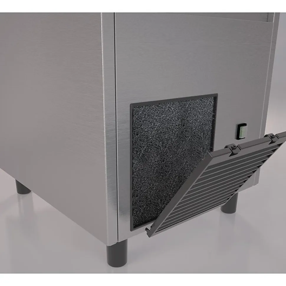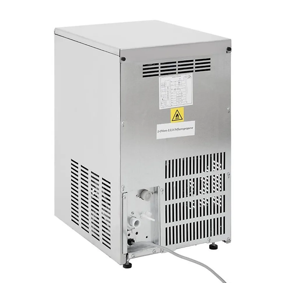 La machine à glaçons à aspersion produit de la glace cristalline de qualité supérieure. La machine à glaçons à aspersion produit de la glace cristalline de qualité supérieure. Le système à aspersion est un excellent moyen de produire de la glace de qualité, transparente, plus solide et fondant moins vite que la glace des fabricants traditionnels. Le fonctionnement et l’entretien sont simples, avec des commandes en façade et une construction solide et facile à nettoyer. La machine à glaçons comprend également un cycle de nettoyage automatique pour conserver la glace propre et hygiénique tout au long des services. Le bac de stockage de 4 kg permet de toujours avoir des glaçons prêts à être utilisés à tout moment.Attention : cet appareil doit évacuer l’eau pour fonctionner et ne s’écoule que par gravité. Si la sortie de vidange est au niveau ou au-dessus de celle du point de vidange de la machine, une pompe externe sera nécessaire.Dimensions: 590(H) x 355(L) x 435(P) mmMatériel: InoxRéfrigérant: R290 / GWP 3Alimentation: 230VPoids: 26 kgPrise: OuiConstruction en acier inoxydable facile à nettoyer permettant de gagner du tempsSystème de fabrication de glace par aspersion – glaçons cristallins à chaque foisProduction maximale : jusqu’à 21kg/24hDimensions des glaçons : 32 x 31 x 35 mmProduit jusqu’à 18 cubes en forme de chapeau par cycleLe cycle de nettoyage automatique intégré maximise l’hygiène de la glaceVidange par gravitéBac de stockage de glace hygiénique et antibactérien. Capacité : 4kg Argent – l35.5- L0.1- P43.5- h59- Inox