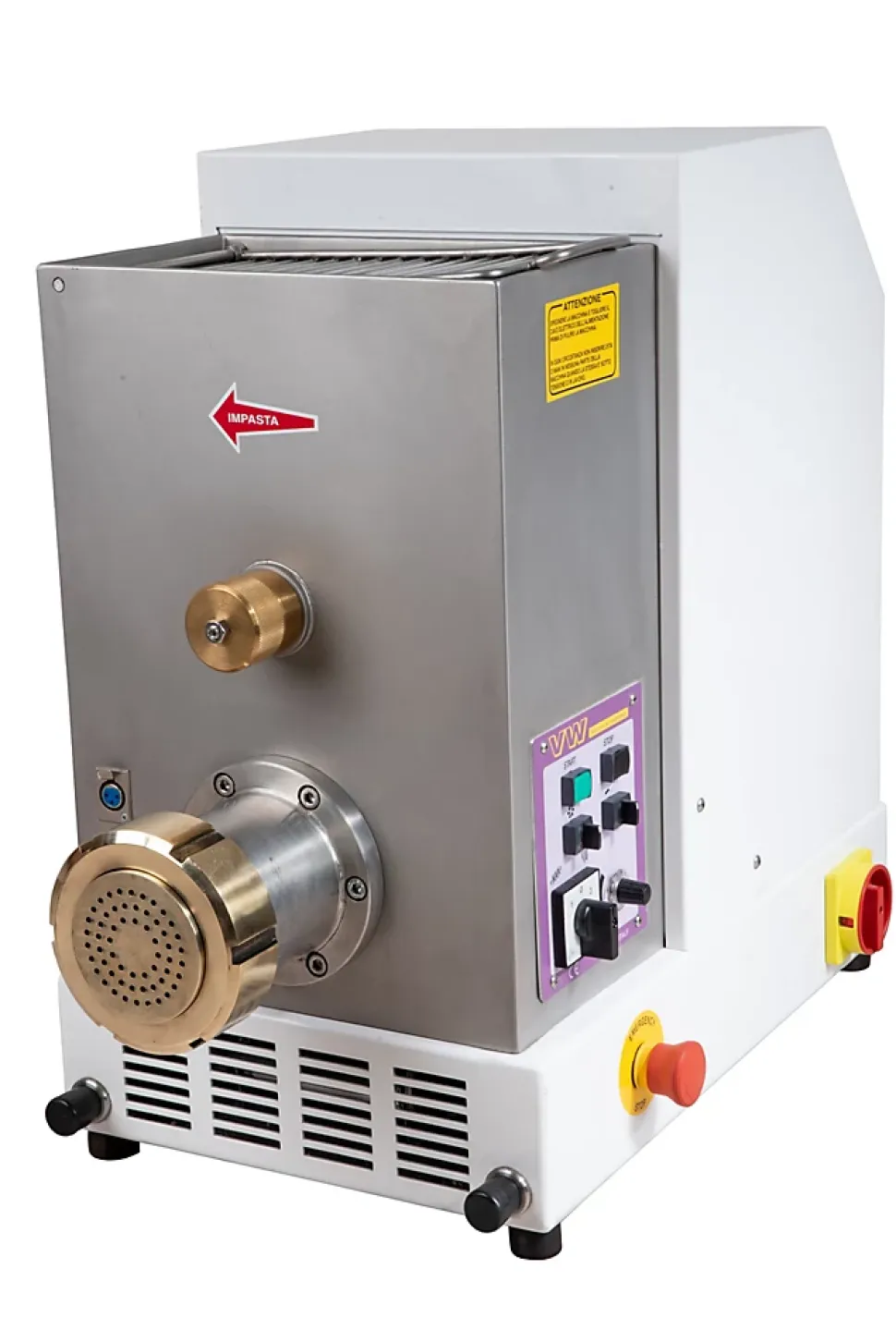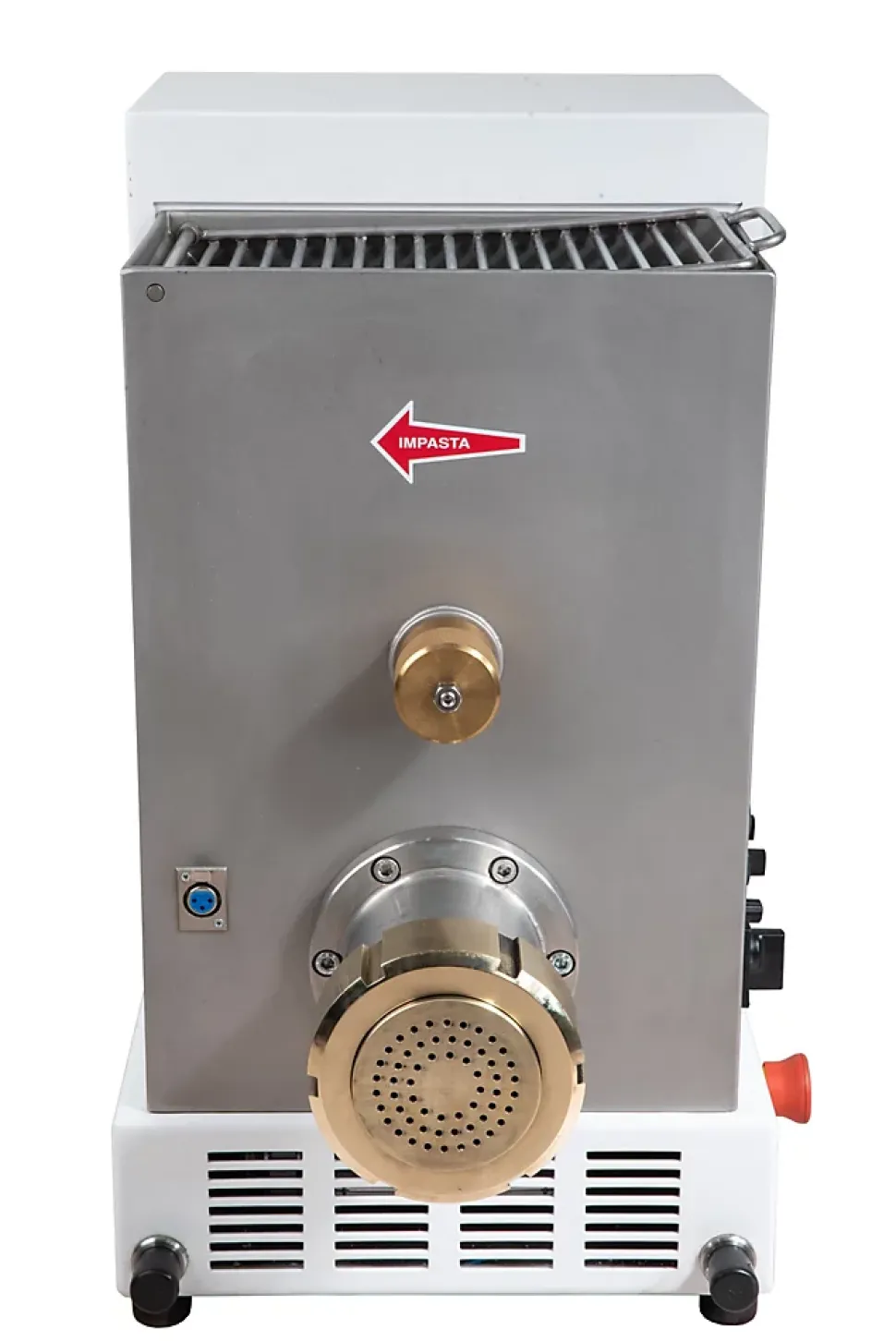 Machine à pâtes fraiche professionnelle. Machine automatique, très fiable. Fonctionnement simple et efficace. Convient aux aux restaurants, aux plats à emporter, aux fast-foods et à l’ensemble du secteur de la restauration.Trémie en acier inoxydable AISI 304Double chaîneEpaisseur de la tôle de la trémie 4 mmVis en bronze et aluminium pour alimentsRefroidissement par eau courante (toute la longueur du cylindre est refroidie)VentilateurInstallation pour couteau électroniqueTrémie traitée pour faciliter le nettoyage (soudure interne)Filière fournie : SpaghettiTrémie de mélange : 8 kgProduction horaire : 26 kg/hDiamètre de la matrice : 73,7 x 65,7Moteur : 1,5 kWTension : 230 / 400 VPoids net : 115 kgDimensions de la machine : 35 x 60 x 60 cm