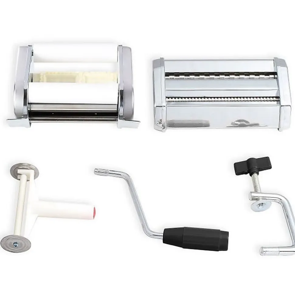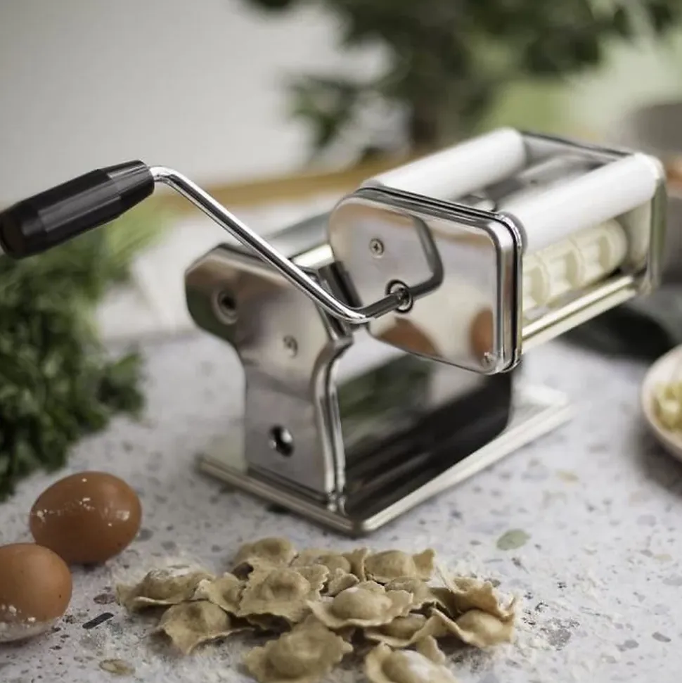 - Accessoires inclus : découpeur, manivelle détachable, moule à ravioli (bande 3 raviolis), et serre-joint pour fixation au plan de travail.