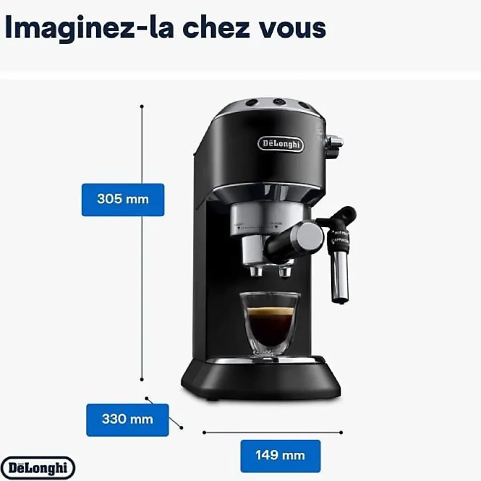La DELONGHI EC 685.BK Dedica Style est une machine expresso compacte et élégante qui combine design italien et performances professionnelles. Elle offre une pression de 15 bars, un système Thermoblock pour un préchauffage rapide, un mousseur à lait manuel pour diverses boissons lactées, et un entretien simplifié grâce à son bac égouttoir amovible et son filtre anti-calcaire intégré.