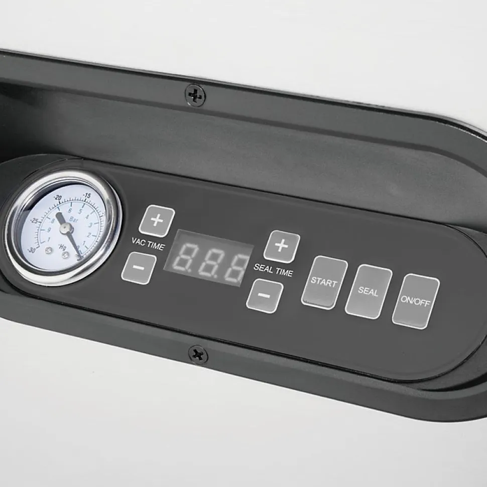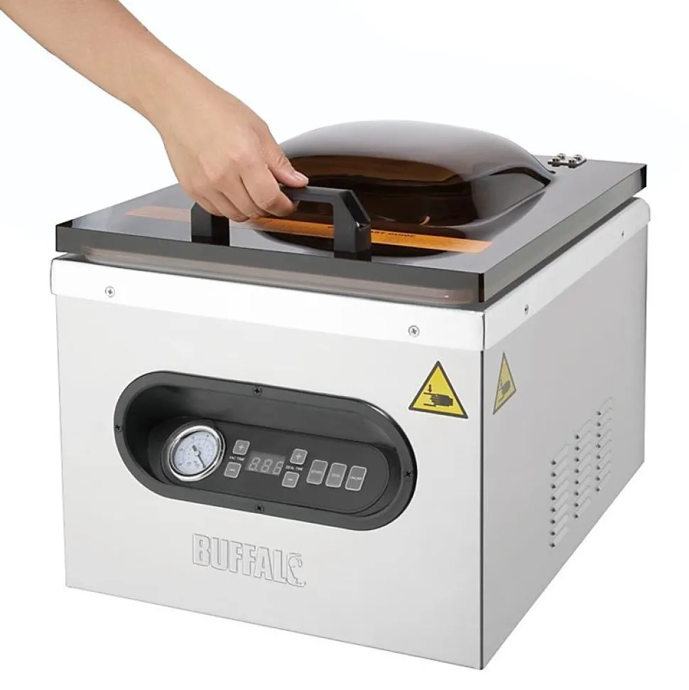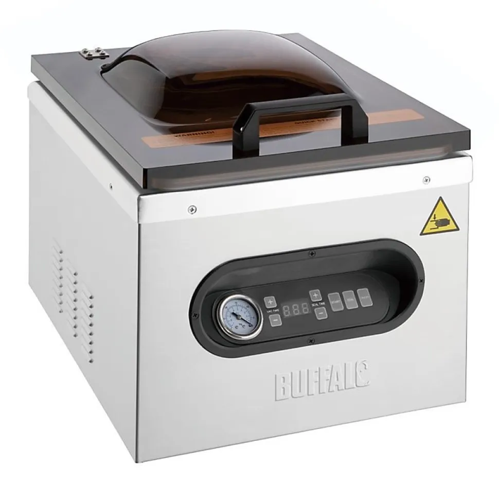 La machine à emballer sous vide à chambre Buffalo est facile à utiliser, extrêmement fiable et offre un rendement très élevé. Scellant instantanément les aliments ou les liquides dans des emballages faciles à stocker, la machine à emballer sous vide Buffalo prépare les aliments pour les refroidir, les congeler ou les cuire en portions précises. Les actions de vide et de scellage sont réglables et une fois scellés, les sacs sous vide sont parfaits pour une utilisation avec un bain-marie sous vide. Une fenêtre de visualisation permet de surveiller les aliments ou les liquides pendant le processus de mise sous vide et la construction en acier inoxydable rend cette machine exceptionnellement hygiénique et facile à nettoyer. Convient aux sacs d’emballage sous vide lisses ou gaufrés. Pour les sacs sous vide compatibles, veuillez vous reporter à l’onglet ci-dessous.NB : le remplacement de la barre de soudure n’est pas couvert par la garantie. Marque: Buffalo Dimensions: 366(H) x 425(L) x 359(P) mm Matériel: Inox Alimentation: 220-240V Poids: 22,3 kg Chambre à vide d’air profonde grande capacité de 80 mm La pince à sac facile à fixer assure un placement sécurisé du sac Temps de scellage réglable de 3 à 9 secondes – scellez avec précision Pression directe de la pompe : 29,7 ± 0,5 % Scelle les sacs jusqu’à 300 mm de largeur Manomètre et fenêtre de visualisation conviviaux – voyez instantanément la progression du vide Pavé de commande numérique intuitif et minuterie Convient pour une utilisation avec des sacs sous-vide plats ou gaufrés. Pour les sacs sous-vide compatibles, veuillez consulter l’onglet accessoires ci-dessous