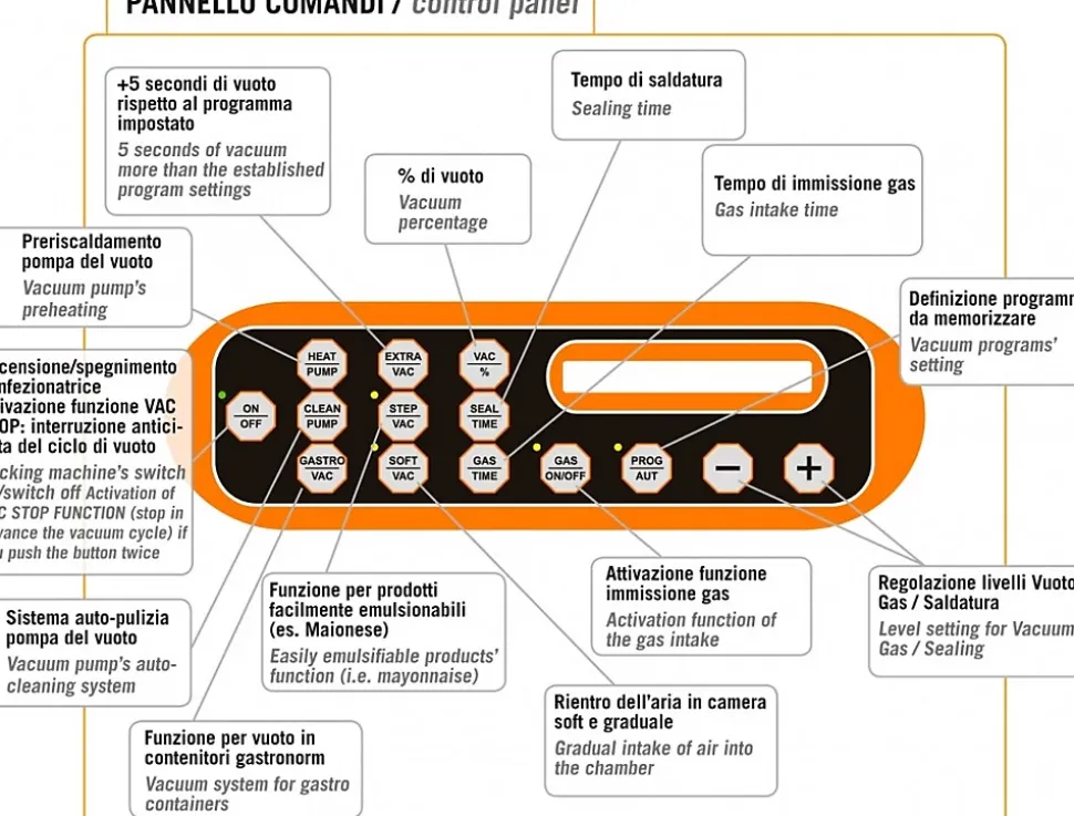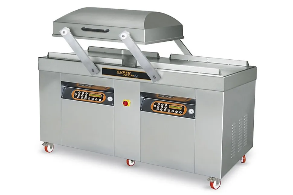 Sous videuse a cloche industrielle de chez Lavezzini possède 4 barres de soudure de 800 mm ainsi que 20 programmes mémorisables. La dimensions des 2 chambres est 2 x(830 x 740 x 230 mm). Ce modèle représente une excellente solution pour toute la clientèle exigeante qui recherche un produit robuste, fiable et de qualité, un appareil auquel vous pouvez demander un charge de production importante, avec certitude de bons résultats pour les industries de moyennes et grandes tailles. SUPER MEGA SUPER TECH permet une production dense. SUPER MEGA SUPER TECH Lavezzini a une structure toute en acier inoxydable, 4 barres de soudure de 800 mm montée sur pistons, une pompe à bain d’huile DVP de 120 m3/h qui permet un vide final a 99 %, manomètre de contrôle du vide, affichage LCD 20 programmes mémorisables, cloche montée sur vérins. Munie de roulettes, la machine à emballer sous vide série ULTRA Super-Tech Lavezzini se déplace facilement afin de permettre son nettoyage et celui de son environnement pour satisfaire les normes d’hygiènes .Structure : InoxDim. d’encombrement : 1900 x 800 x 1150 H Dim. de la chambre : 2 x ( 830 x 740 x 230 H ) Barres de soudure : 800 mm x 4 Pompe à vide : Q = 100/120 m3/h-HUILE Poids : 360 kg Puissance : 2700 WVoltage : 380 V/50-60 Hz