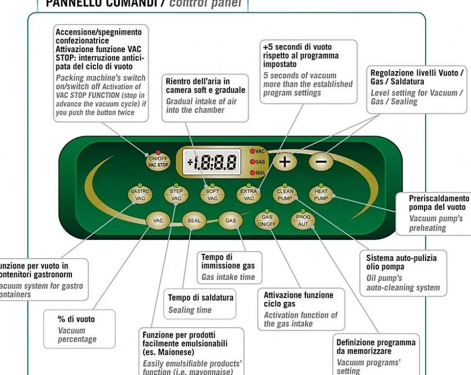 Machine sous vide a clocheLavezzini toute en inox, sur roues pour faciliter son déplacement, dotée de 2 barres de soudure de 450 mm. Idéale, cette machine sous vide alimentaire vous assure toute la sécurité liée au respect des normes sanitaires et un gain de temps considérable. Avec ses roulettes et sa structure inox , cette machine se déplace et s’entretien très facilement. Cette machine sous vide à cloche professionnelle vous permet de profiter de tous les avantages de la mise sous vide. Conçue pour emballer tous types de produits solides ou liquides rapidement. Pratique elle vous offre toute la sécurité liée au respect des normes sanitaires, et un gain de temps considérable. Prévue pour une utilisation de grande production, comme les boucheries, les supermarchés ou fabrications artisanales. 2 barres de soudures de 450 mm chacune recouvertes de téflon permettent un travail rapide, soigné et efficaceStructure inoxsur rouesAffichage LCD Multi-programmesDim. d’encombrement : 680 x 570 x 1050 H Dim. de la chambre : 560 x 460 x 220 H Barre de soudure :450 mm (x2) Pompe à vide : Q = 20/24 m3/h-HUILE Poids : 110 kg Puissance : 1050 W Voltage 230 V/50-60Cette machine nécessite des sacs sous vides lisses.