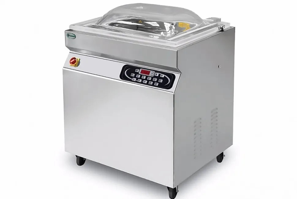 Machine sous vide à cloche inox professionnelle – Lavezzini se déplace et s’entretien très facilement. Prévue pour une utilisation de grande production, comme les boucheries, supermarchés ou fabrications artisanales. Dotée de 2 barres de soudure de 550 mm qui permettent un travail rapide, soigné et efficace. Avec ses roulettes et sa structure inox, la machine Lapack 550 S se déplace et s’entretien très facilement. Cette machine sous vide à cloche professionnelle vous permet de profiter de tous les avantages de la mise sous vide. Conçue pour emballer tous types de produits solides ou liquides rapidement. Pratique elle vous offre toute la sécurité liée au respect des normes sanitaires, et un gain de temps considérable. Prévue pour une utilisation de grande production, comme les boucheries, les supermarchés ou fabrications artisanales . 2 barres de soudures de 550 mm permettent un travail rapide, soigné et efficaceStructure inox sur rouesAffichage LCD Multi-programmesDim.d’encombrement : 840 x 680 x 1050 HDim.de la chambre : 720 x 570 x 220 HBarre de soudure : 550 mm (x 2)Pompe à vide 60/72 m3/H.Poids : 160 kgPuissance : 1450 Wvoltage 230 V/50-60Cette machine nécessite des sacs sous vides lisses.