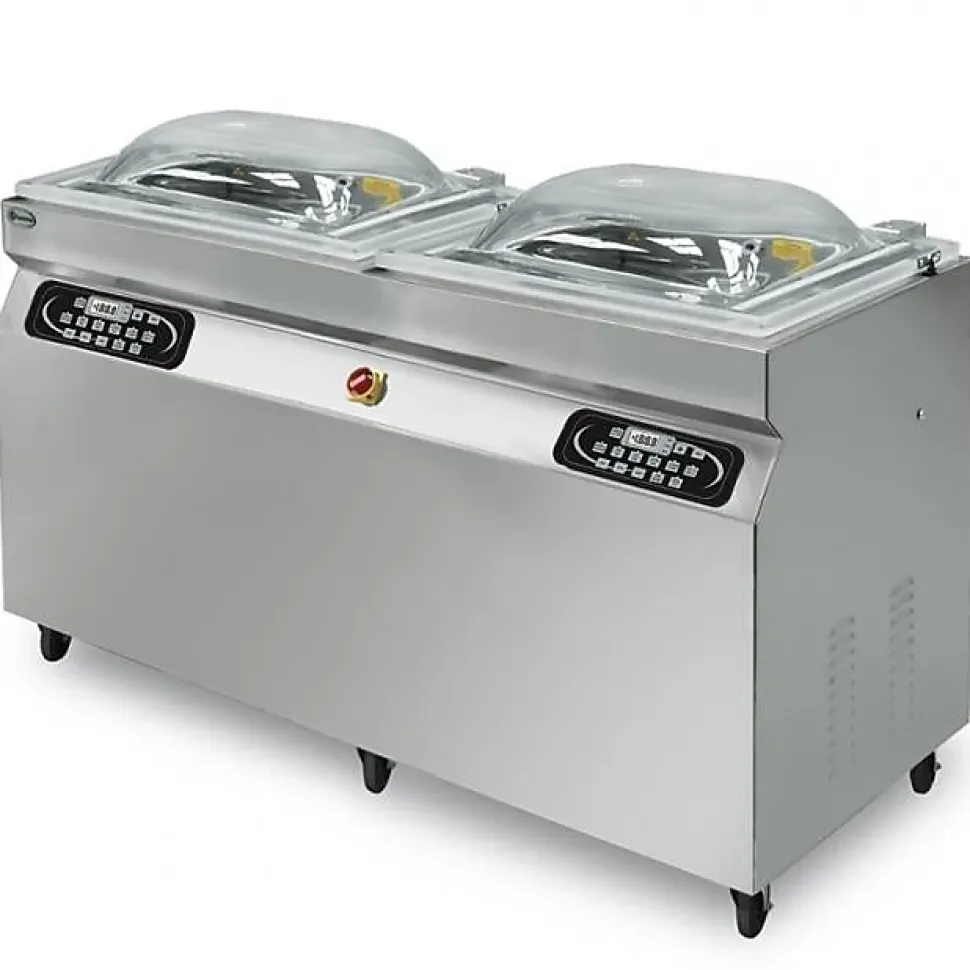 Profiter de tous les avantages de la mise sous vide avec cette machine sous vide double cloche de la marque Lavezzini. Platine électronique masquée et protégée des interférences extérieures. Emballeuse sous vide en inox et montée sur roulettes avec 2 barres de soudures de 550 mm. Machines sous vides professionnelles à cloche de grande qualité, conçues pour une utilisation du genre industrielle. Electronique et mécanique performants, fiabilité et continuité opérationnelle. Les pompes à vide installées très silencieuses offrent des performances vraiment surprenantes. Avec ses roulettes et sa structure inox , la machine Lapack 500 S Duplex se déplace et s’entretien très facilement. Cette machine sous vide à cloche professionnelle vous permet de profiter de tous les avantages de la mise sous vide. Conçu pour emballer tous types de produits solides ou liquides rapidement.Pratique elle vous offre toute la sécurité liée au respect des normes sanitaires, et un gain de temps considérable. Conçue pour une utilisation industrielle.Prévue pour une utilisation de grande production, comme les boucheries, les supermarchés ou fabrications artisanales. 2 barres de soudures de 550 mm permettent un travail rapide, soigné et efficaceStructure inox sur roues.Affichage LCD Multi-programmesDim.d’encombrement : 1680 x 680 x 1050 HDim.de la chambre : (720 x 570 x 220 H ) x 2Barre de soudure : (2 x 550 mm) x 2Pompe à vide 100/120 m3/HPoids : 260 kgPuissance : 2600 Wvoltage 400 V/50-60Cette machine nécessite des sacs sous vides lisses.